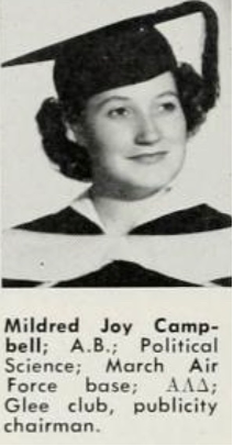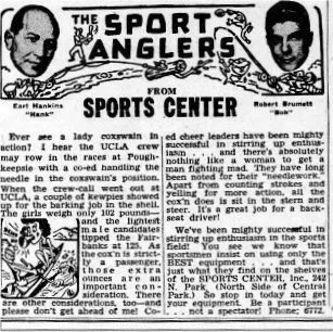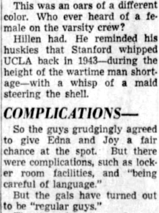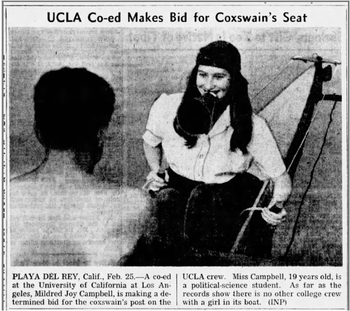 During February of 1948, Mildred Joy Campbell made news across the country and was discussed in a syndicated men’s outdoors columns with several different titles, as she made a bid to become a coxswain on the UCLA men’s crew. She and her roommate Edna Saxton reported to the call out that spring along with 78 male crew aspirants. News articles stated that the rowers were “leery at first” to give the women a try, but were allowed by UCLA’s coach Bob Hillen. At least in news photos, Mildred Campbell was shown actually coxing a shell, often with a header above the photo as “Barking Beauty.” Mildred graduated in 1949 and her yearbook caption did not include mention of the crew, it was mentioned in Edna’s 2008 obituary. A month prior to the first race of the 1948 season both young women were released from the team after an anonymous poison pen letter was sent to coach Hillen and the athletic director claiming that the presence of the two female coxswains was a “detriment to the prestige of the male sex.” UCLA Daily Bruin Reporter Joe Bleeden wrote that the letter went on to say that men were degraded during the last war by having to train under women, and that seemed a shame to have the he-men on the team commanded by girls now. Joe Bleeden, “Girl Coxswains Canned; Hillen Seeks Replacements”, UCLA Daily Bruin, 2 Apr 1948, 6. There was support for the two young women through a letter to the editor. John Johnson, “For Girls and Victories”, UCLA Daily Bruin, 6 Apr 1948, 7.