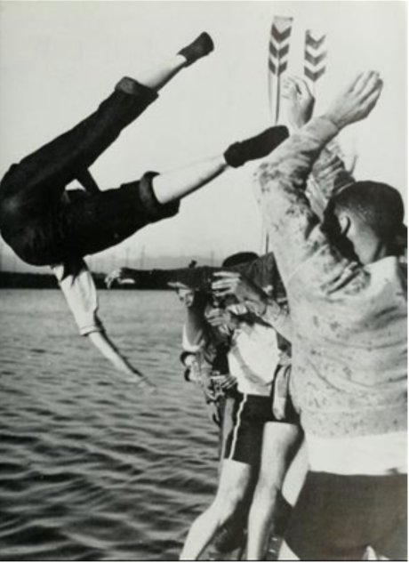 An image of Edna Saxton appeared in several newspapers and in the Southern Campus yearbook, however hers was of her backside as she was airborne. Often printed with a header of “Oops-a-Daisy” and a caption “Girl coxswain Edna Saxton (in air) is tossed into a Los Angeles, Cal., creek by University of California at Los Angeles crew members rehearsing the traditional dunking. Edna is one of UCLA’s two girl coxswains, both were chosen for the job because of their light weight.” “Oops-a-Daisy!”, Santa Cruz (CA) Sentinel, 14 Apr 1948, 5.