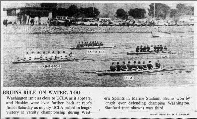 UCLA first attends the Intercollegiate Rowing Association championship and first victory over Cal in 1966; wins Western Sprints in 1967 defeating Washington.