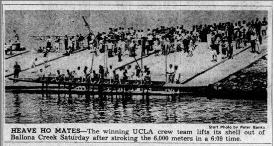 UCLA’s freshman team lost a pair of races to UC Irvine, rowing for their first season. In the second freshman race UC Irvine finished in 6:34.0 to UCLA’s 6:36.0. In the first freshman race UCLA had built up a lead in the first half of the race but had fallen behind by 1500 meters, at the finish UC Irvine recorded a time of 6:29.0 to UCLA’s 6:33.0. “Brubabe Oarsmen Take Lickin’ From Anteaters”, UCLA Daily Bruin, 25 Apr 1966, 8.