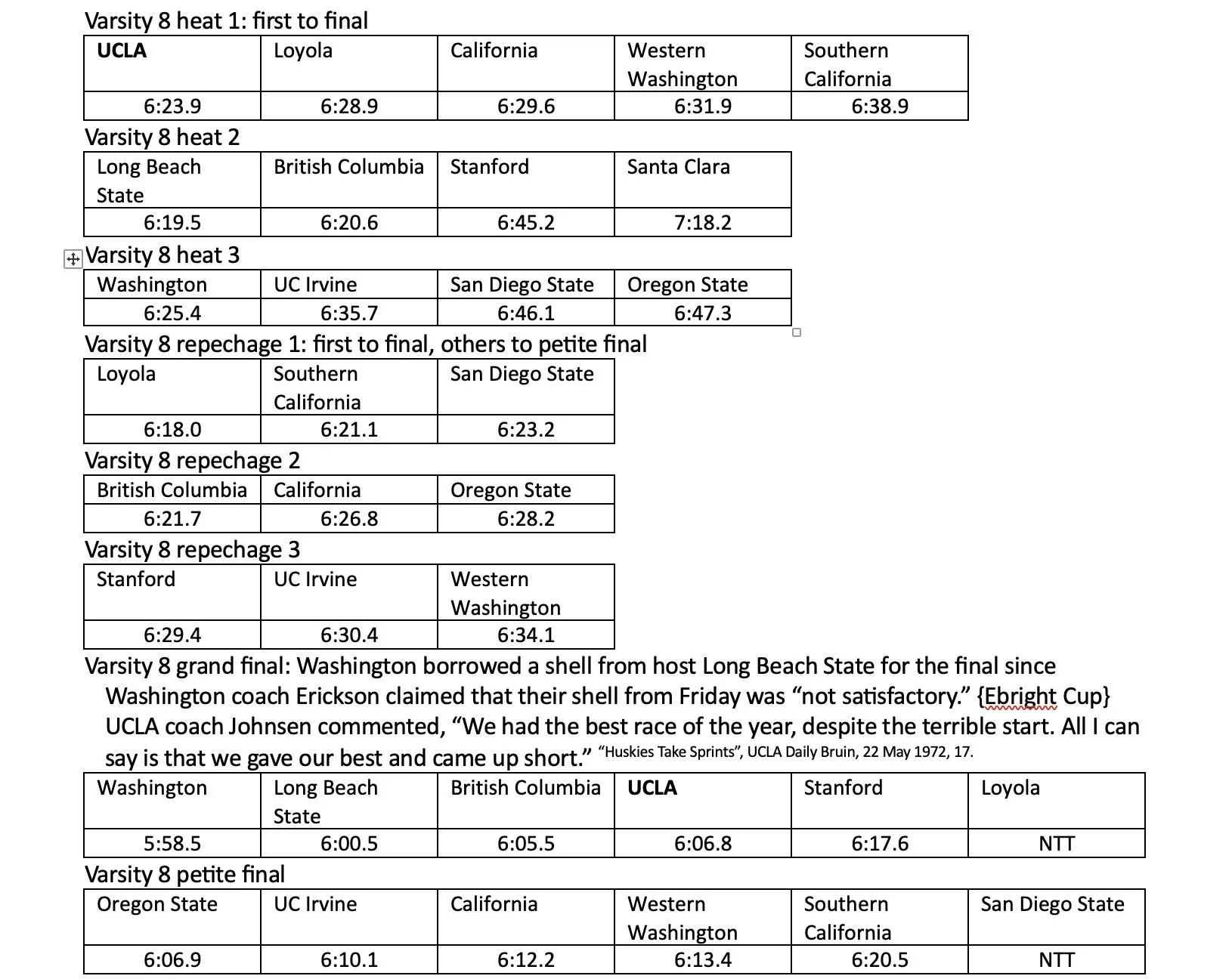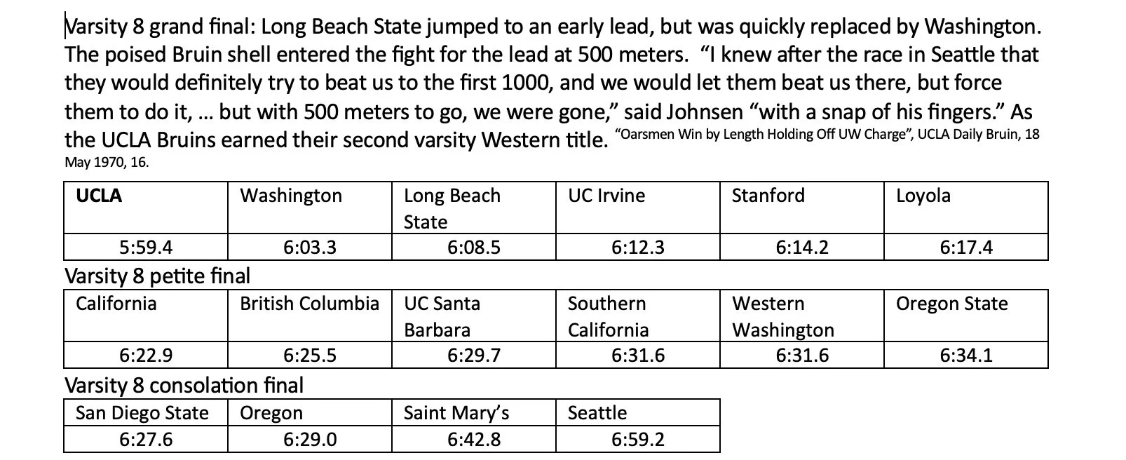 This season was considered the “Finest year since 1966, … crew was added to UCLA’s athletic budget [as a “regular varsity sport” only since 1963-64] after having been subsidized by student body funds for the previous three decades.” Jeff Prugh, “Bruin Crews Seeking Big-Time Recognition”, Los Angeles Times, 7 May 1971, 61.