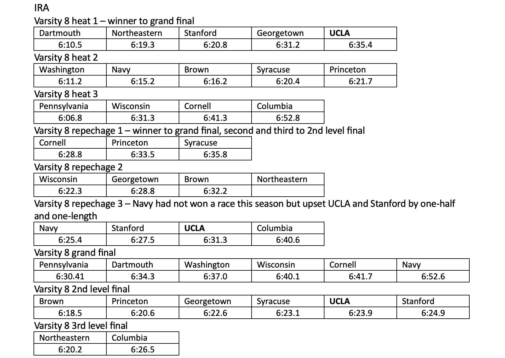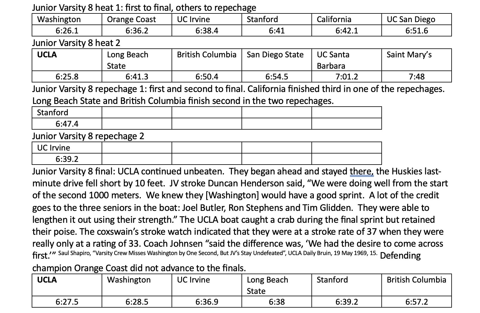 The 1969 IRA: Stanford and UCLA were eliminated from racing in the grand final by Navy in the repechage and Washington was third in the varsity eight final; UCLA placed fourth in the junior varsity with Washington eighth; the freshman eight was a dead-heat between Washington and Pennsylvania; Orange Coast placed second, Loyola was seventh, Oregon State tenth and Long Beach State eleventh in the varsity four. California did not attend.