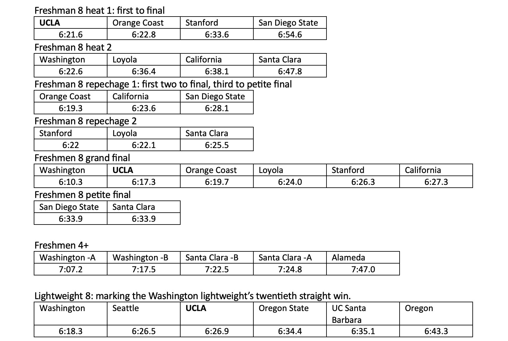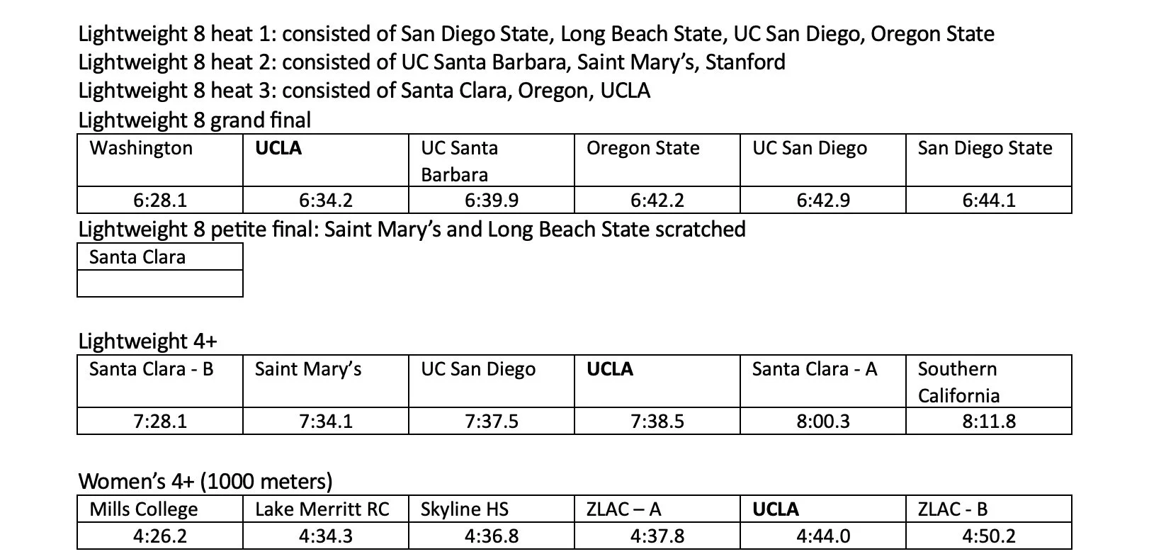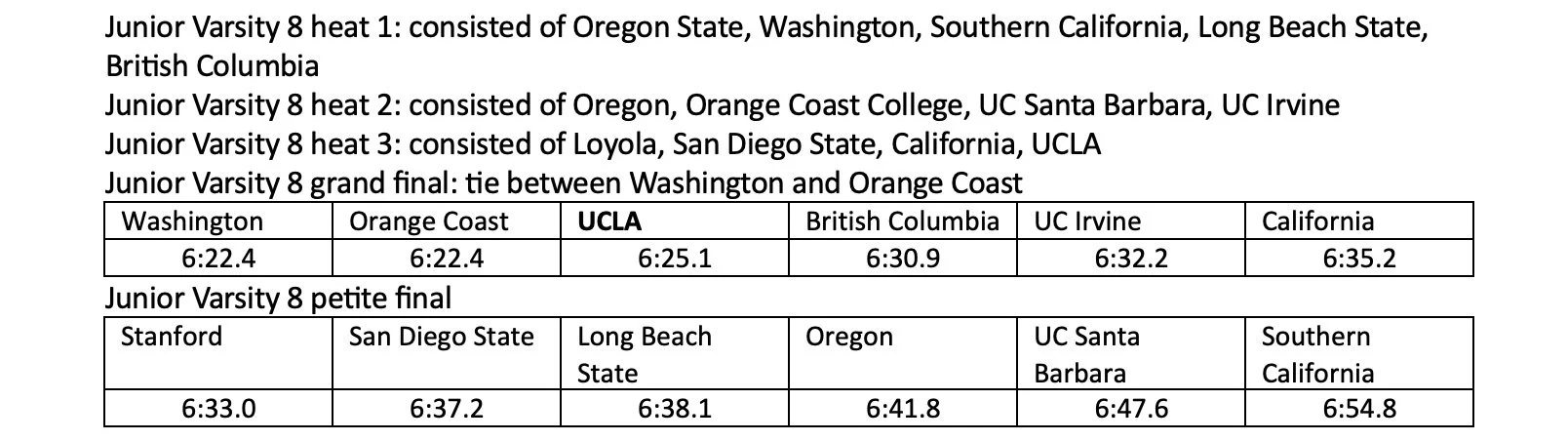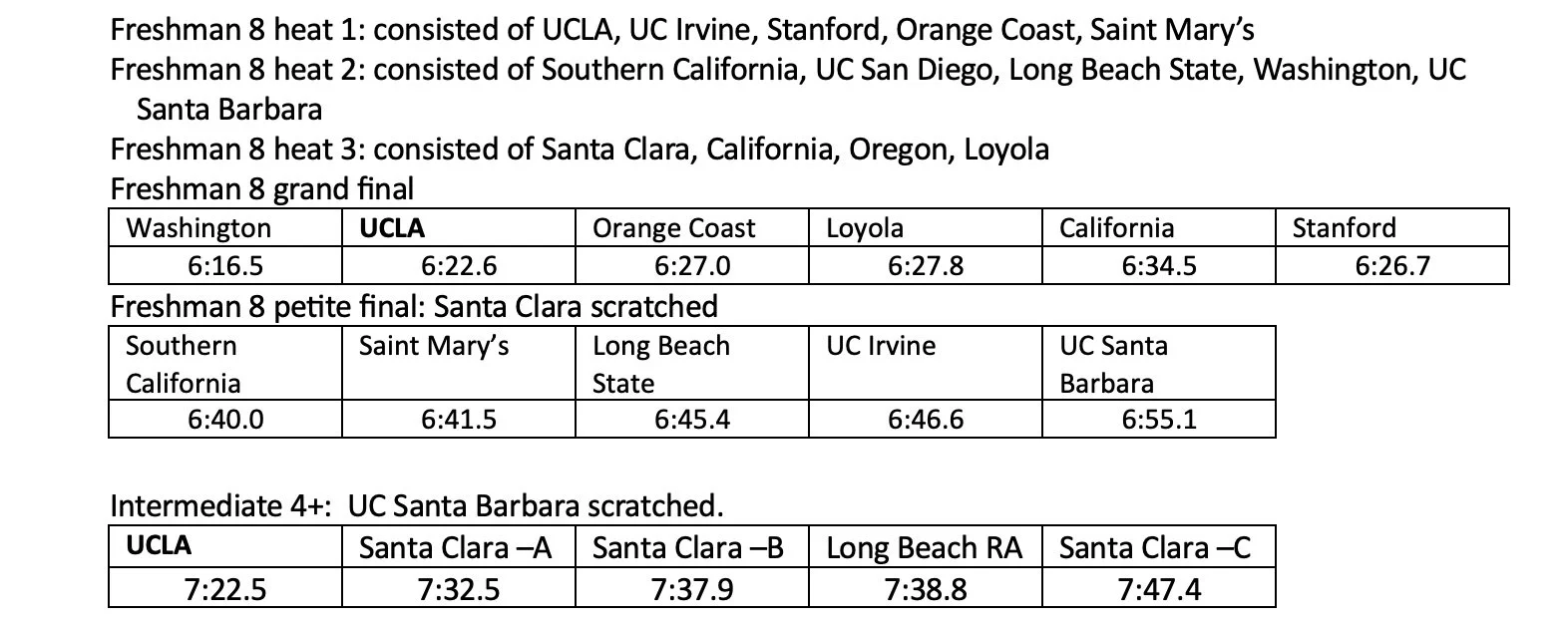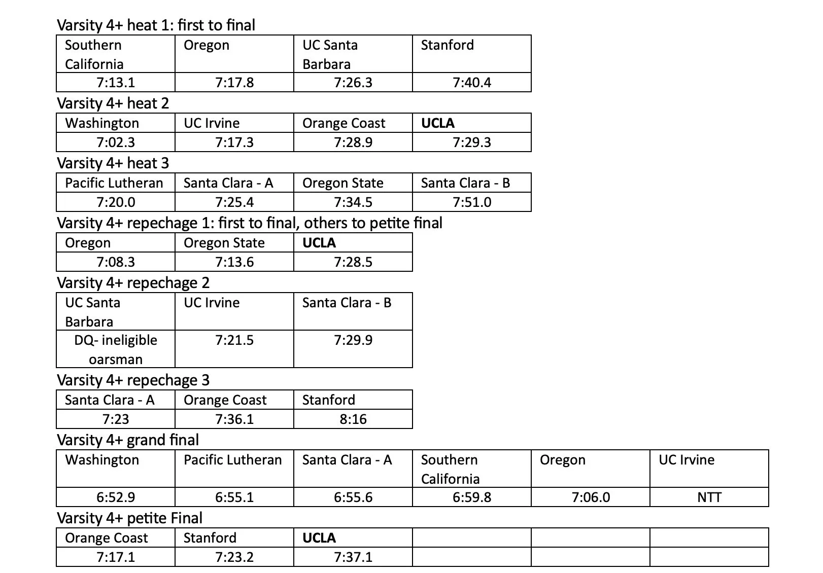 In the Varsity 4+ heat 2, Saint Mary’s finished near the back of one of the heats. UCLA was disqualified for crossing UC Santa Barbara’s path placing Santa Clara as first in that heat. Oregon State posted a time of 7:33.8 ahead of UCLA by 1.5 seconds.