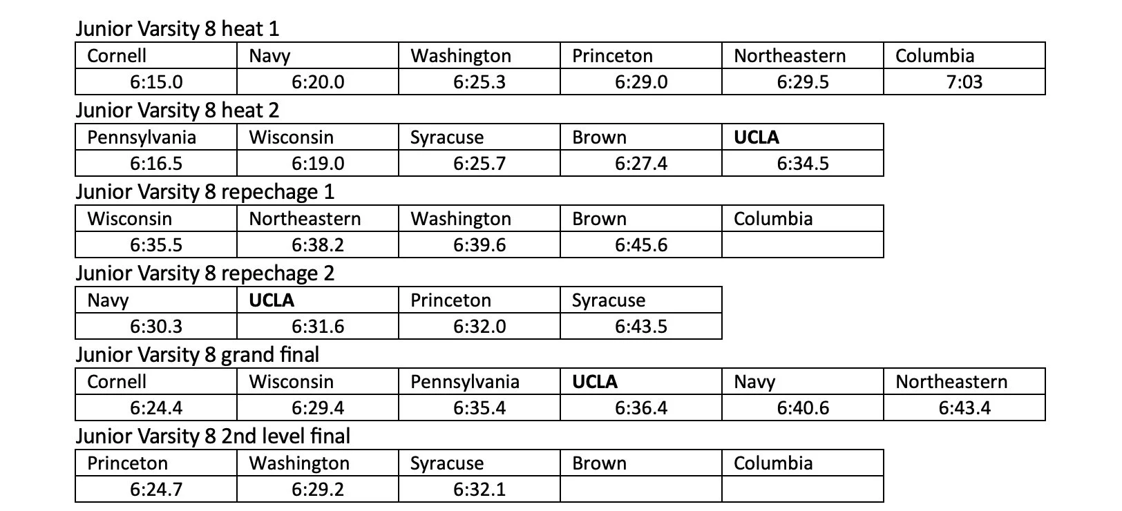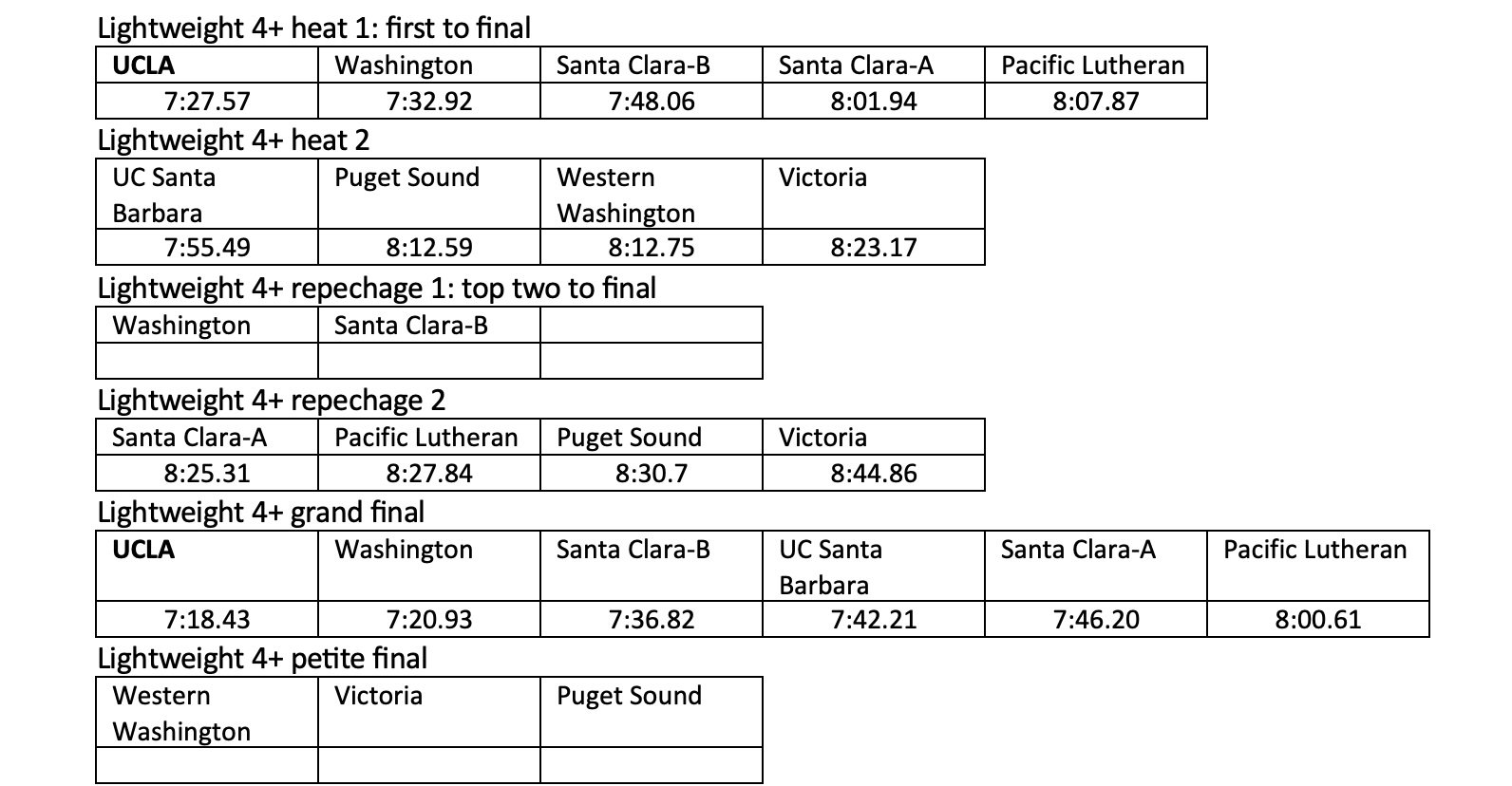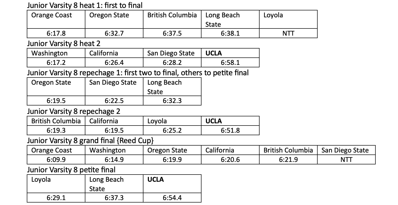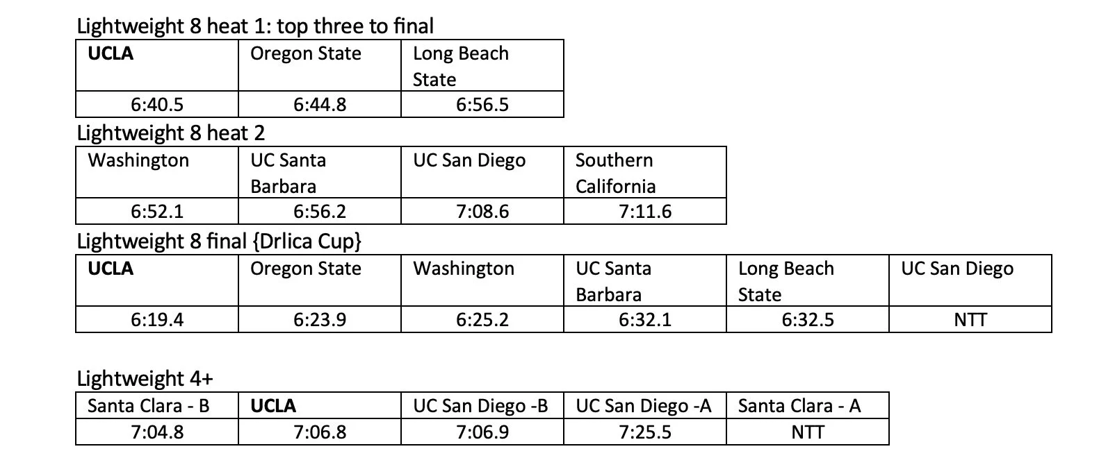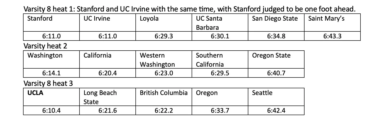 In the Varsity 4+ heat 2, Saint Mary’s finished near the back of one of the heats. UCLA was disqualified for crossing UC Santa Barbara’s path placing Santa Clara as first in that heat. Oregon State posted a time of 7:33.8 ahead of UCLA by 1.5 seconds.