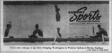 The UCLA lightweight crew won a race on Mission Bay against four other crews by five seconds even though they raced with a broken fin. Saul Shapiro, “Oarsmen Hand Huskies 1st Home Loss Since 1954”, UCLA Daily Bruin, 4 May 1970, 14.