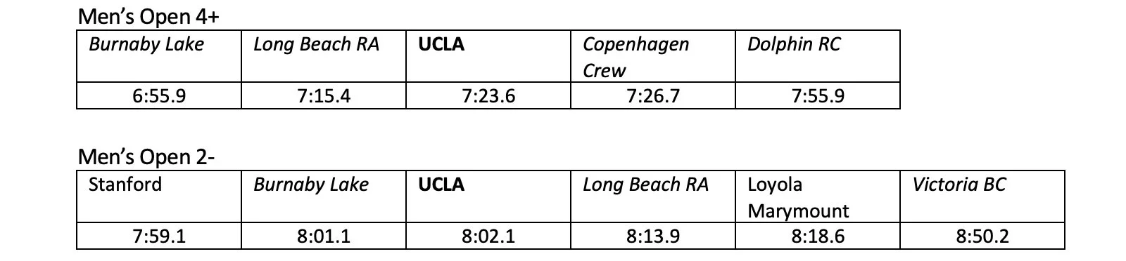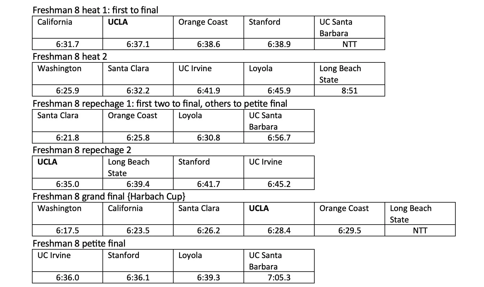 Following the Wallis Cup, UCLA raced the Harbach Cup in Wilmington on Friday and on Saturday hosted Long Beach State. The aggressiveness that Johnsen asked for resulted in a decisive sweep of the weekend regattas. In the varsity Harbach race UCLA (6:36.9) was followed by USC (6:43.3) and Stanford (6:44.7). The Bruin JV (6:38.8) finished ahead of Stanford (6:469) with USC a distant third. The freshman eight resulted in the same finish order with UCLA completing the sweep.