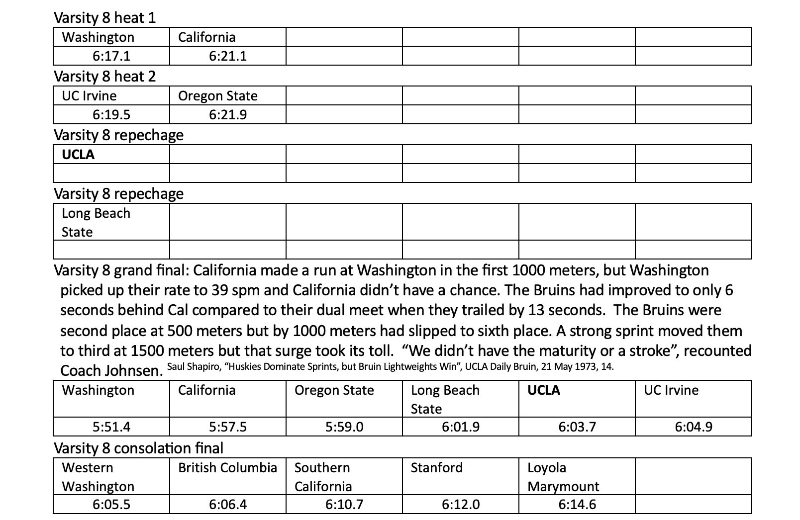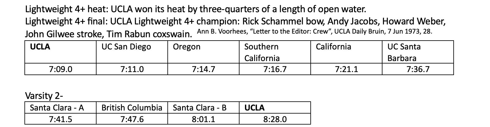 The UCLA women’s 4+ (4:38.7) {Marianne Maloney bow, Jeannie Olson, Shari Sprong, Ann Voorhees stroke, Marie Sanders coxswain} placed second, 7.5 seconds behind Long Beach State-B (4:31.2) and defeated ZLAC-A (4:50.5) Rowing Club, ZLAC-B (4:53.8), UC Santa Barbara (5:05.0) with CSU Long Beach-A was disqualified. Mike Kagen, “Women’s Four Tries to Paddle to Success”, UCLA Daily Bruin, 24 Apr 1973, 12. Long Beach State (4:45.0) also won the girls eight “LBSU 3rd to Washington, Navy”, Long Beach Independent, 8 Apr 1973, 66. followed by UC Santa Barbara (4:52.5), ZLAC (5:01.0) and UCLA (6:11.0). “Crew Classic Results”, San Diego Evening Tribune, 9 Apr 1973, C-2.