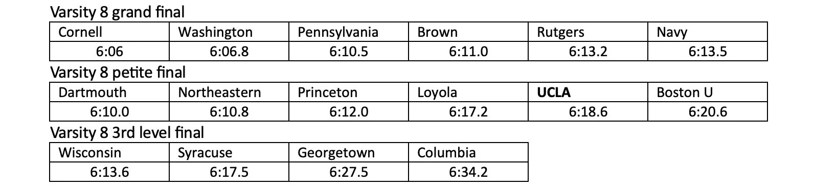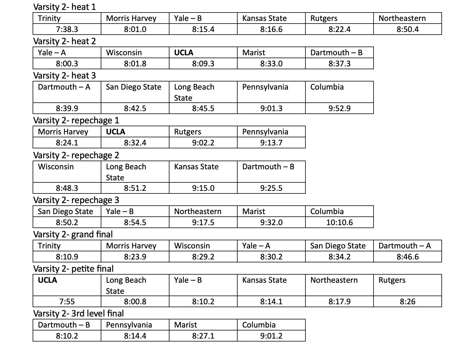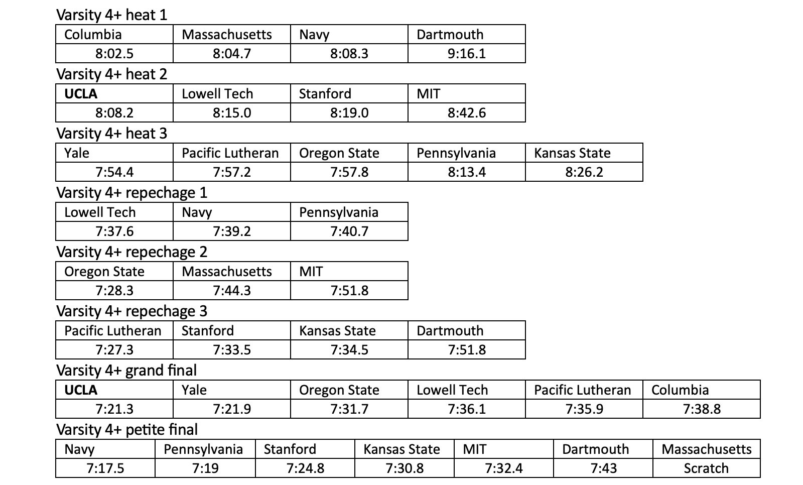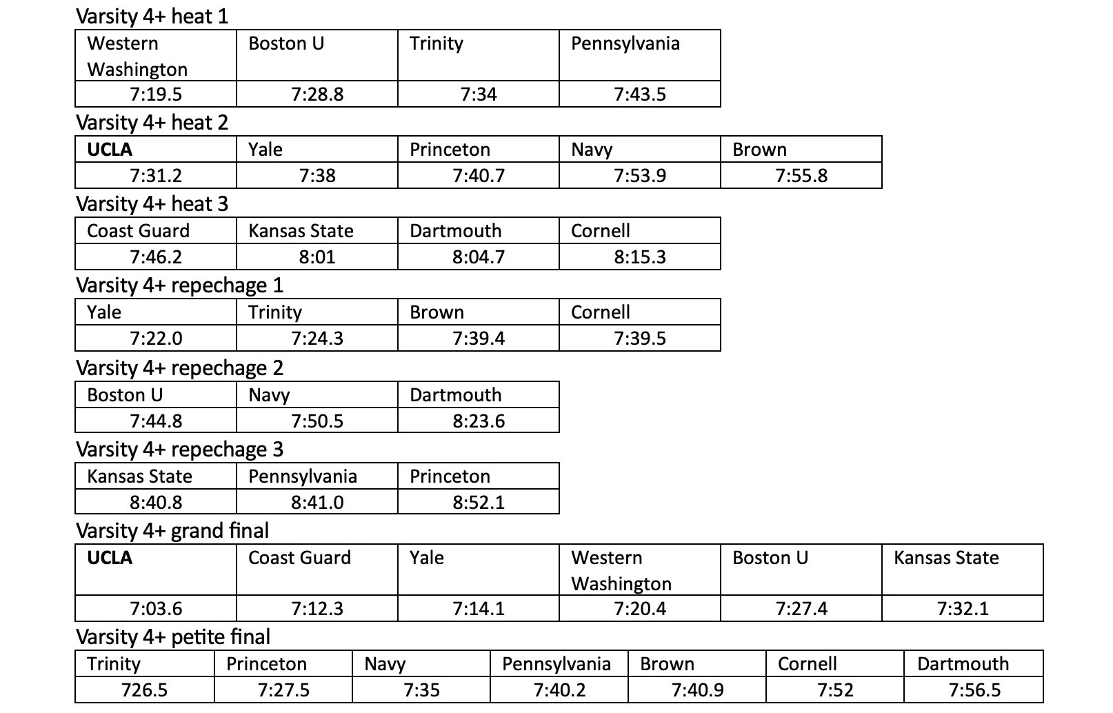 Varsity four [13]: UCLA 1st held off a hard charging Yale crew back-and forth down the course with only 10 feet to spare, after Columbia lead at the start but faded, Oregon State 3rd, Pacific Lutheran 5th
