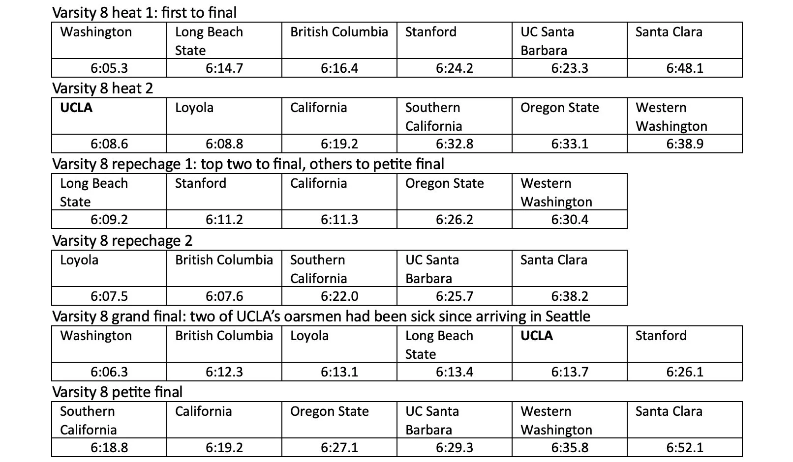 In Southern California, UCLA’s lightweight crew won a race over the UCLA second freshmen and the USC freshmen. Saul Shapiro, “Oarsmen Hand Huskies 1st Home Loss Since 1954”, UCLA Daily Bruin, 4 May 1970, 14. Following the victory over Washington, UCLA’s varsity combination only rowed intact three times of ten outings the next two weeks owing to “colds, sore ankles and a motorcycle accident (Geoff Strand, not serious).” Saul Shapiro, “Oarsmen Face Husky Rematch”, UCLA Daily Bruin, 15 May 1970, 15.