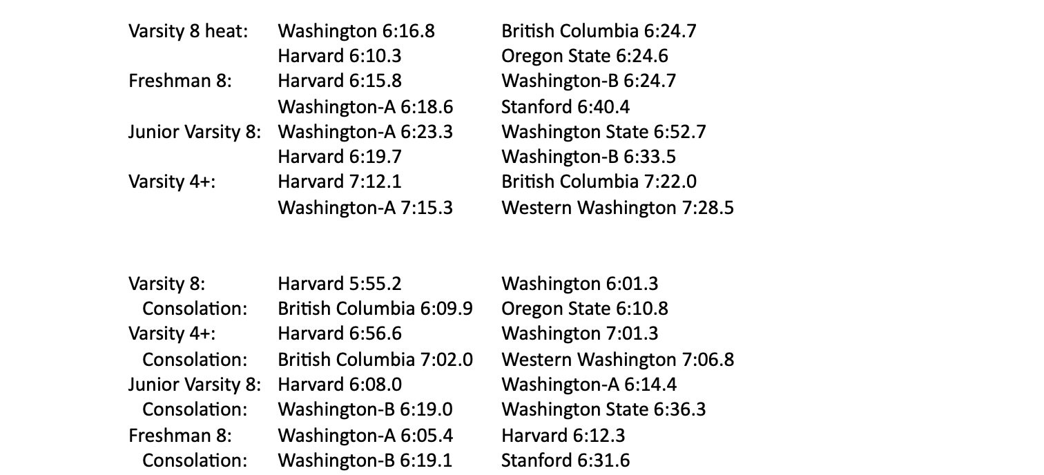 Varsity eight: Washington first. No other West Coast crews were among the fourteen competitors.