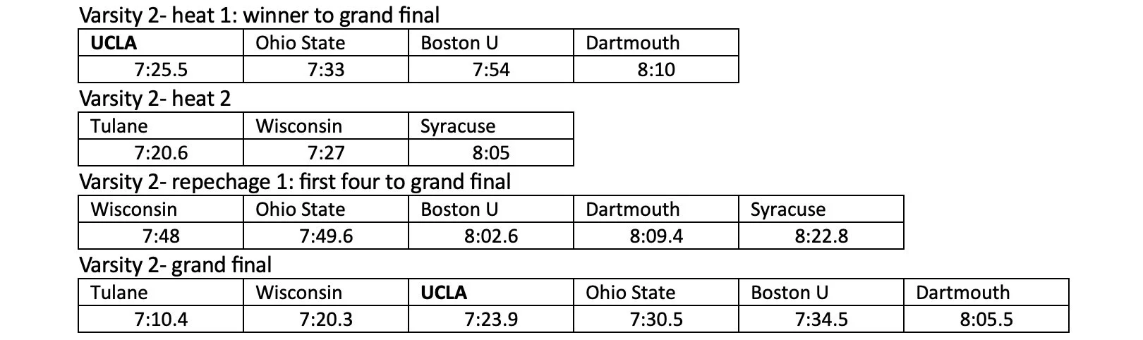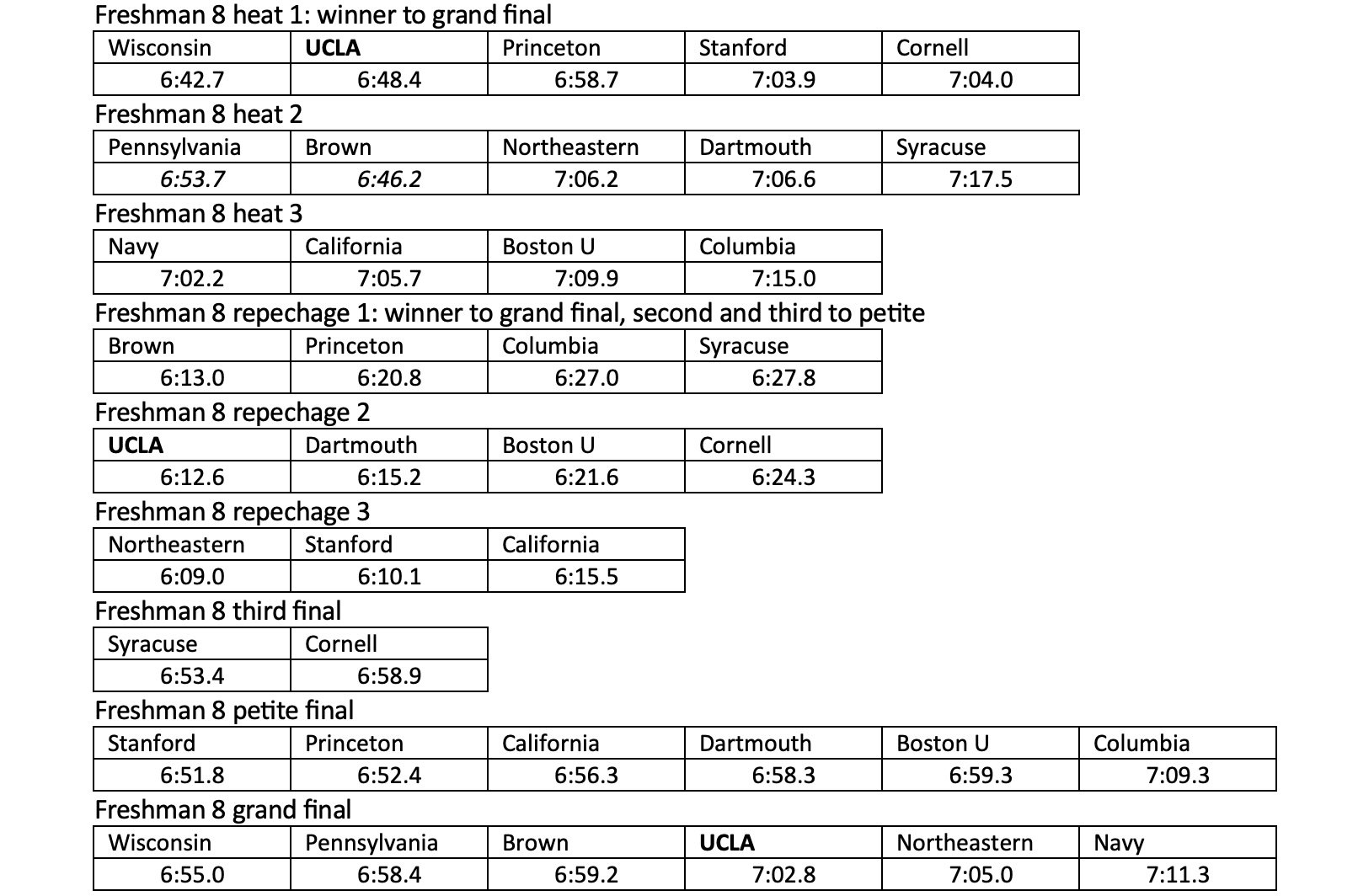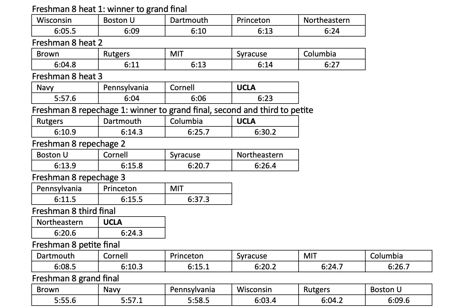 The UCLA lightweight squad raced at the Eastern Sprints, finishing third in the Lightweight Freshman eight behind Harvard and Princeton, and the Lightweight Varsity eight finished third in their event’s petite final (9th) ahead of Pennsylvania and MIT. The same Lightweight Freshman eight finished in second place in the Lightweight Junior Varsity race at the Pacific Coast Championships.
