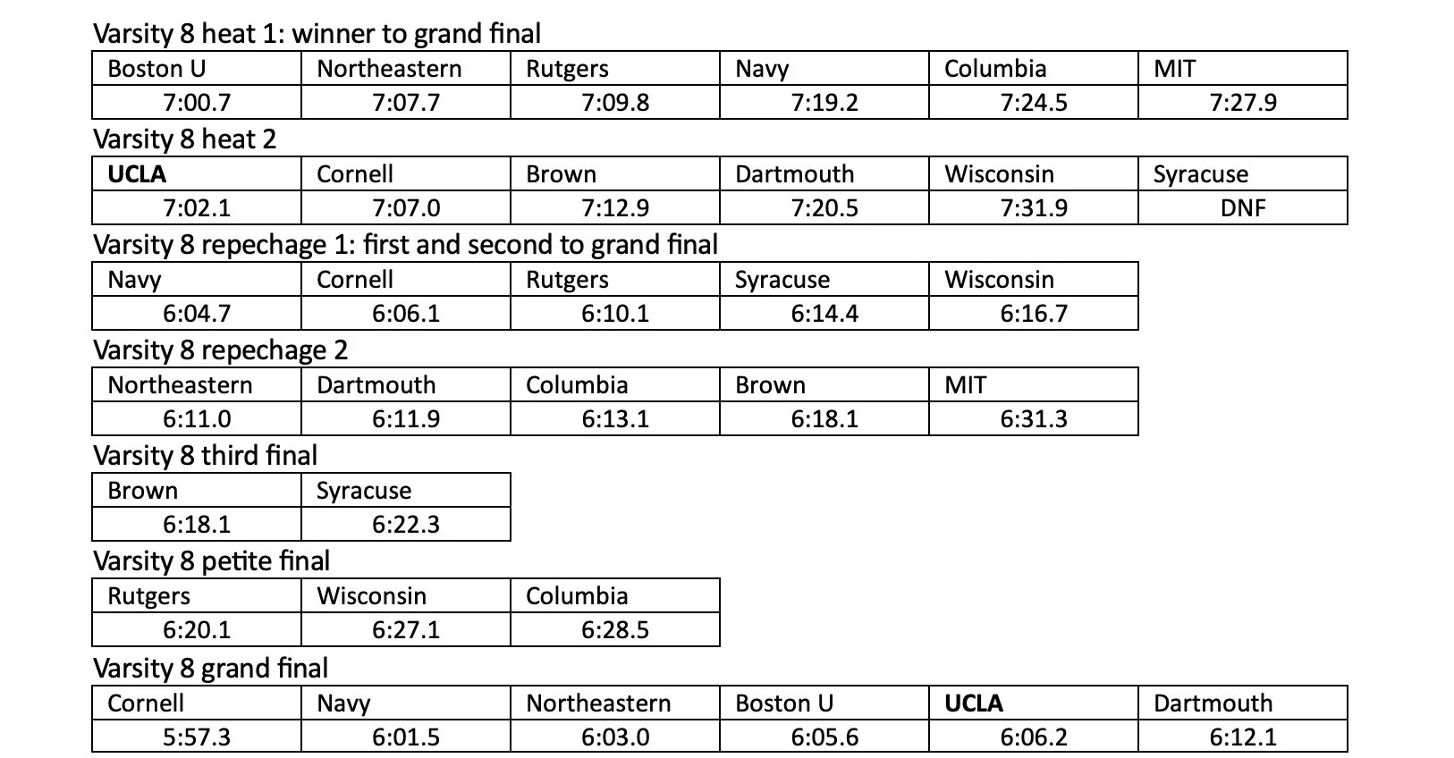 UCLA Varsity wins by 5 seconds over Cal at the Oakland Estuary