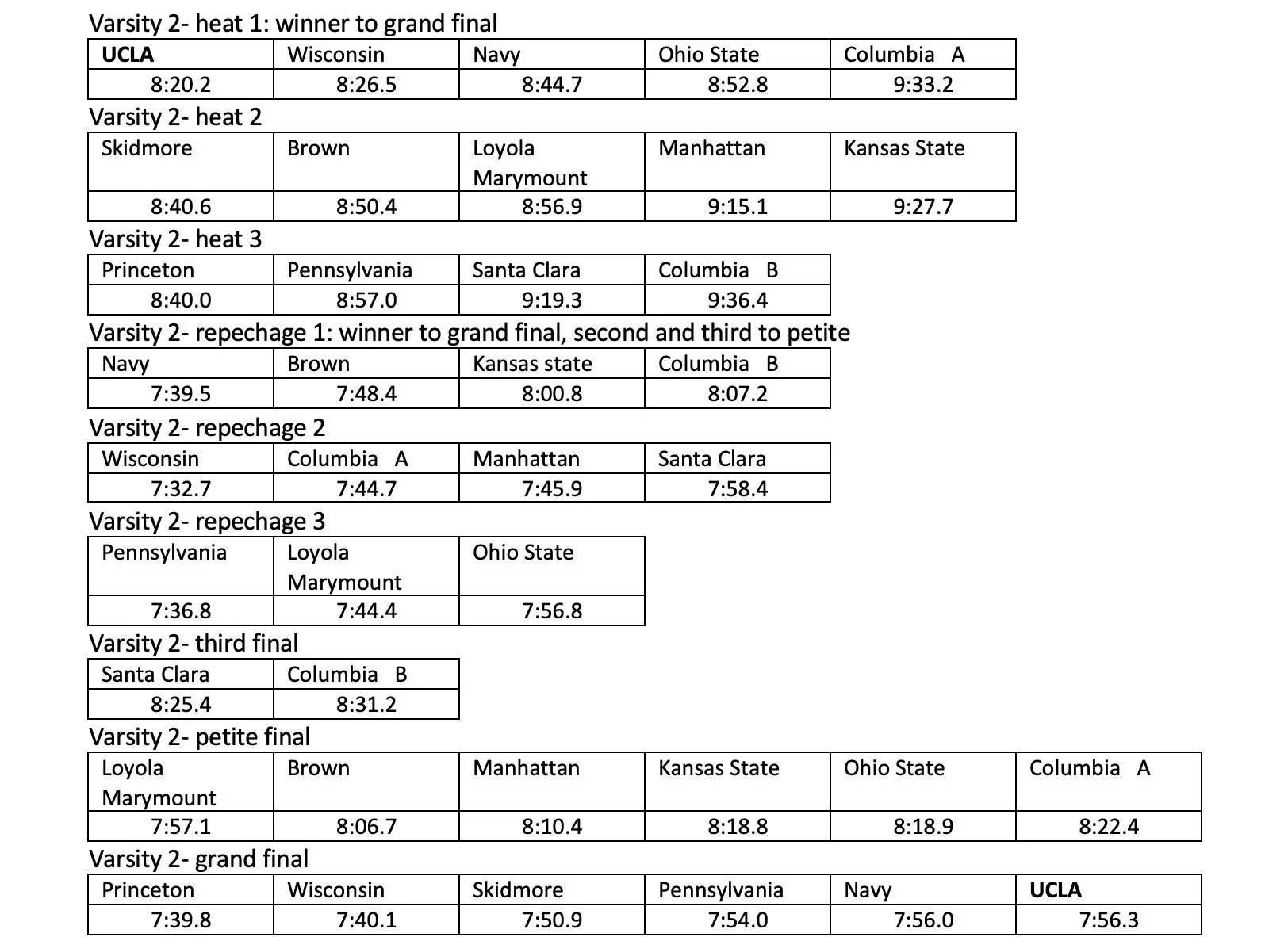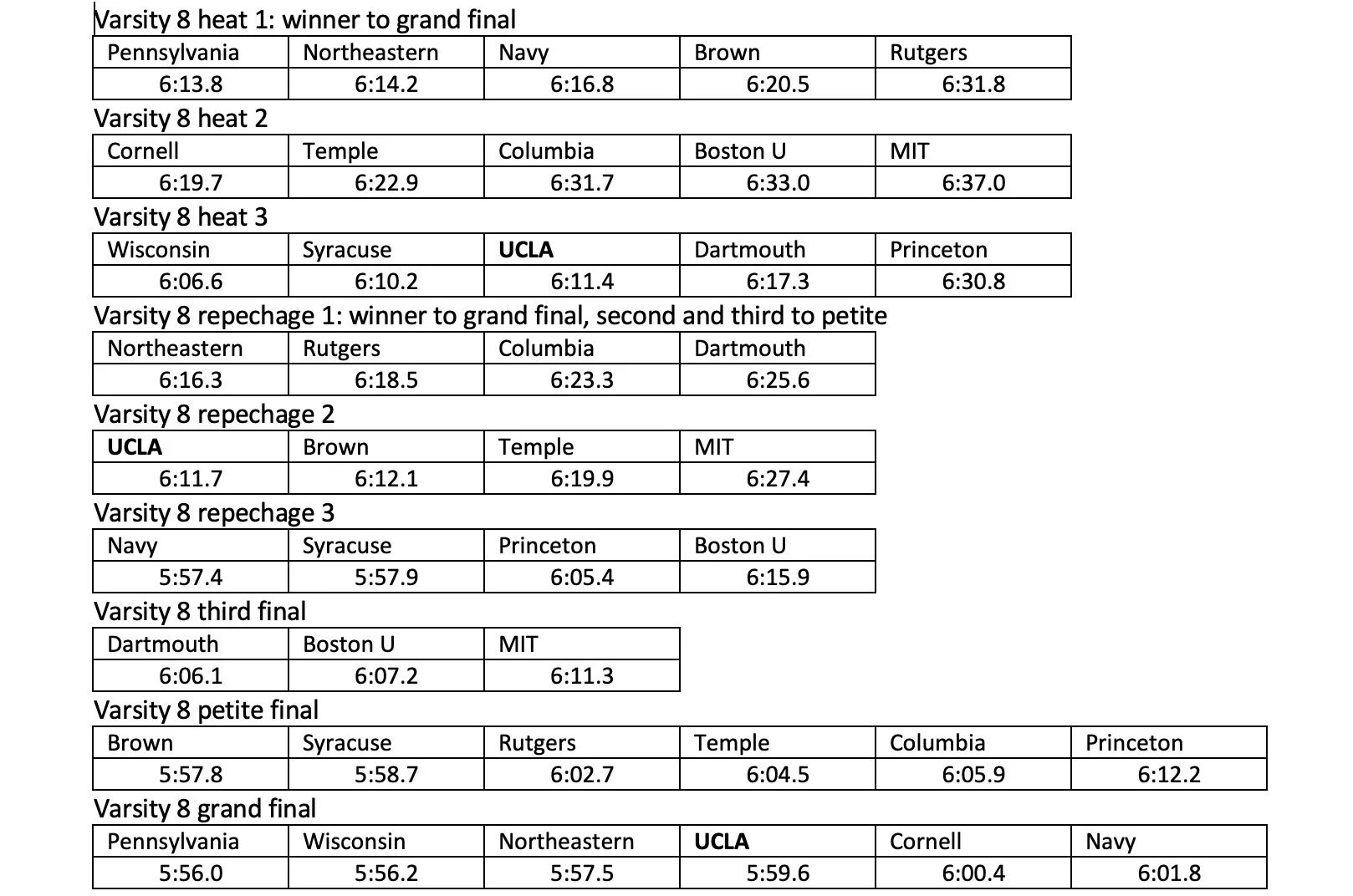 After the IRA the varsity eight, for the second year in a row, placed sixth at the National Collegiate Championship. Harvard won for a third consecutive time and this year Washington placed second 4.5 seconds ahead of the Bruins.