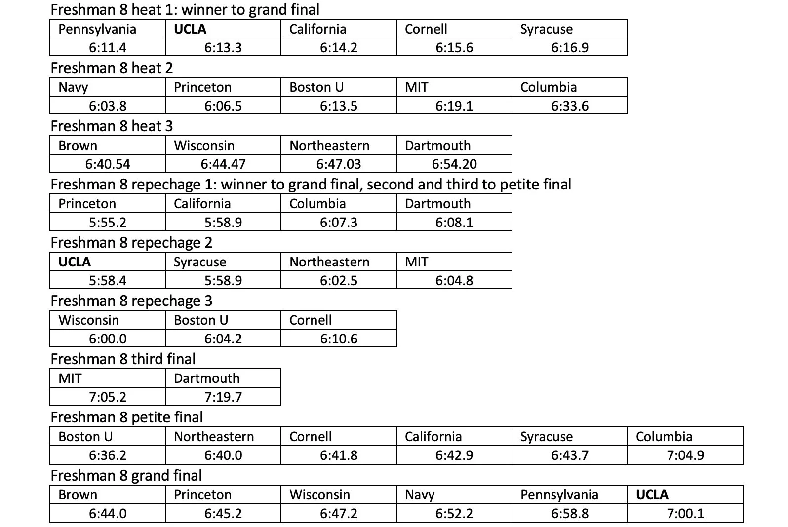 Foregoing the Invitational event at Redwood Shores UCLA attended the inaugural Potomac International Regatta, the organizers sought to bring together the best collegiate crews from both coasts along with England’s Oxford and Cambridge. Oxford and Cambridge were winding down following their 4.5 mile annual Boat Race. UCLA won its semifinal over Princeton, Wisconsin-B and Virginia, and went on to finish second in the final to Harvard (5:35.44) ahead of Wisconsin and Princeton. The UCLA junior varsity and freshmen eights both finished second to Wisconsin in their finals.