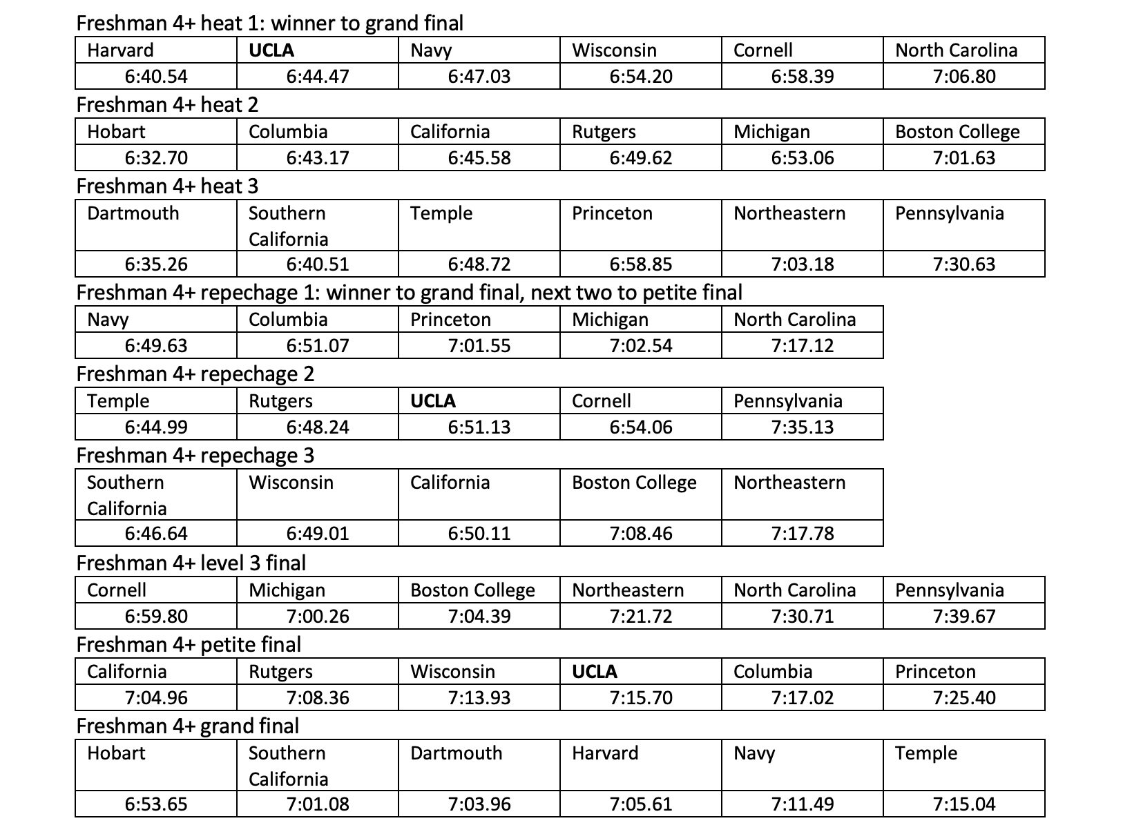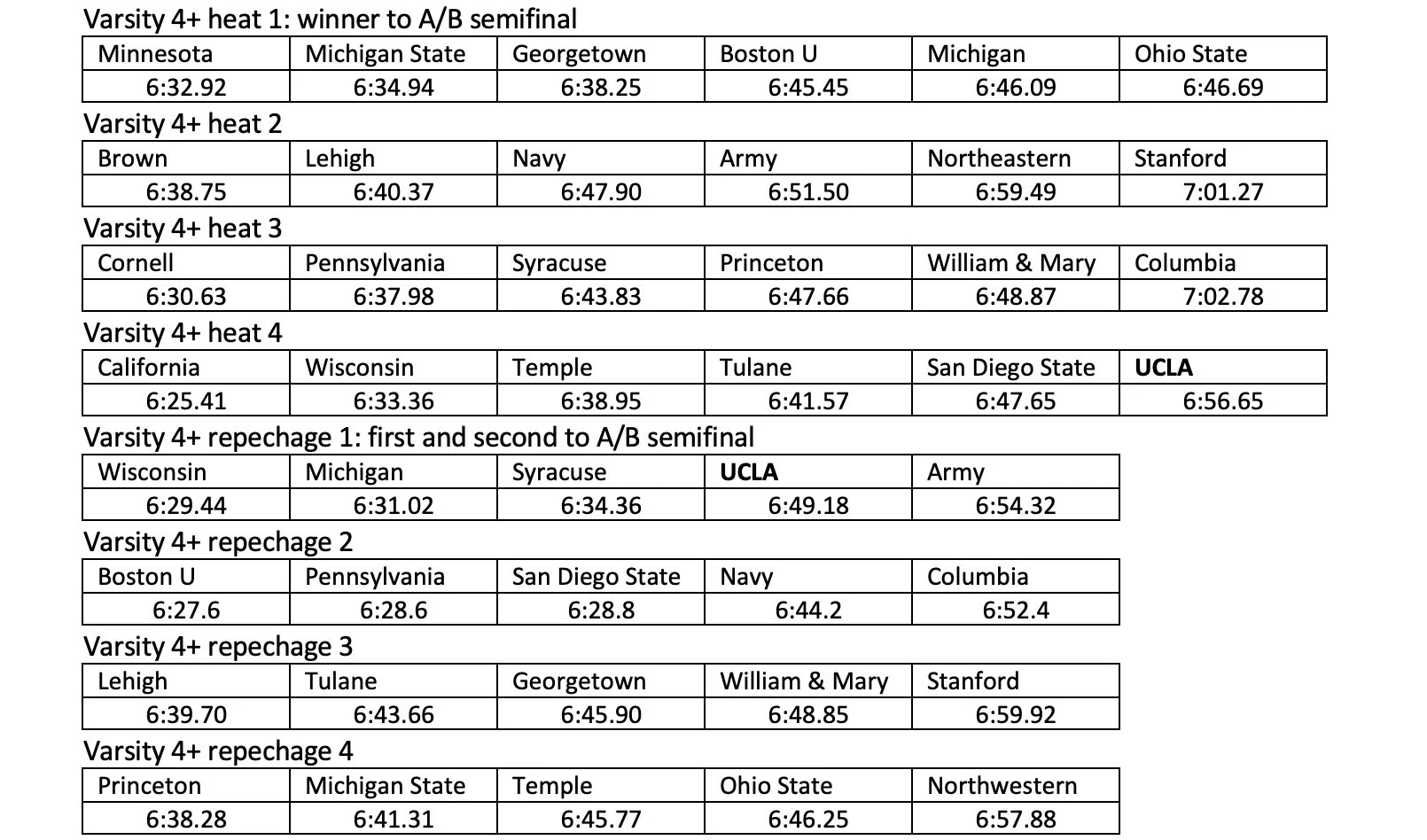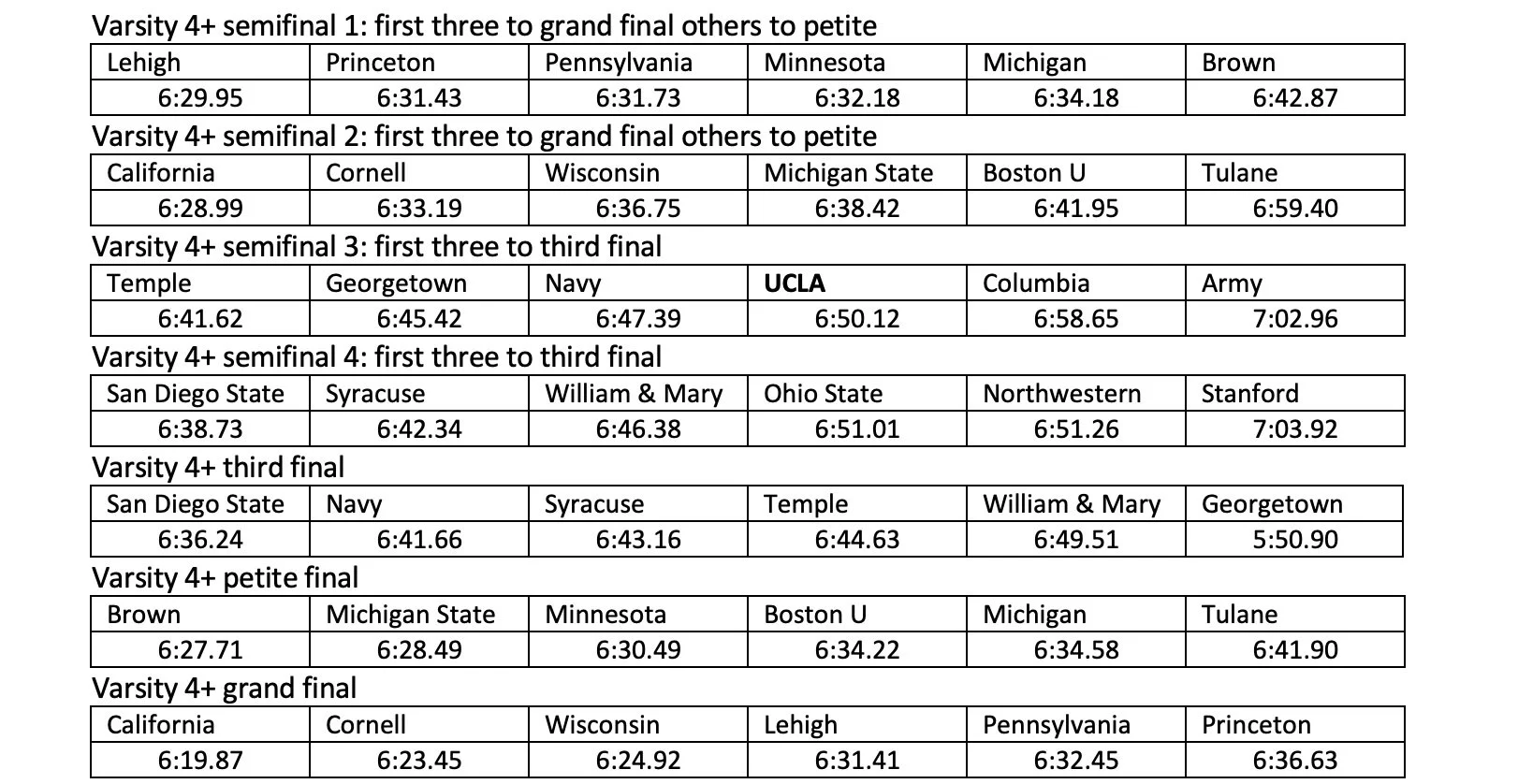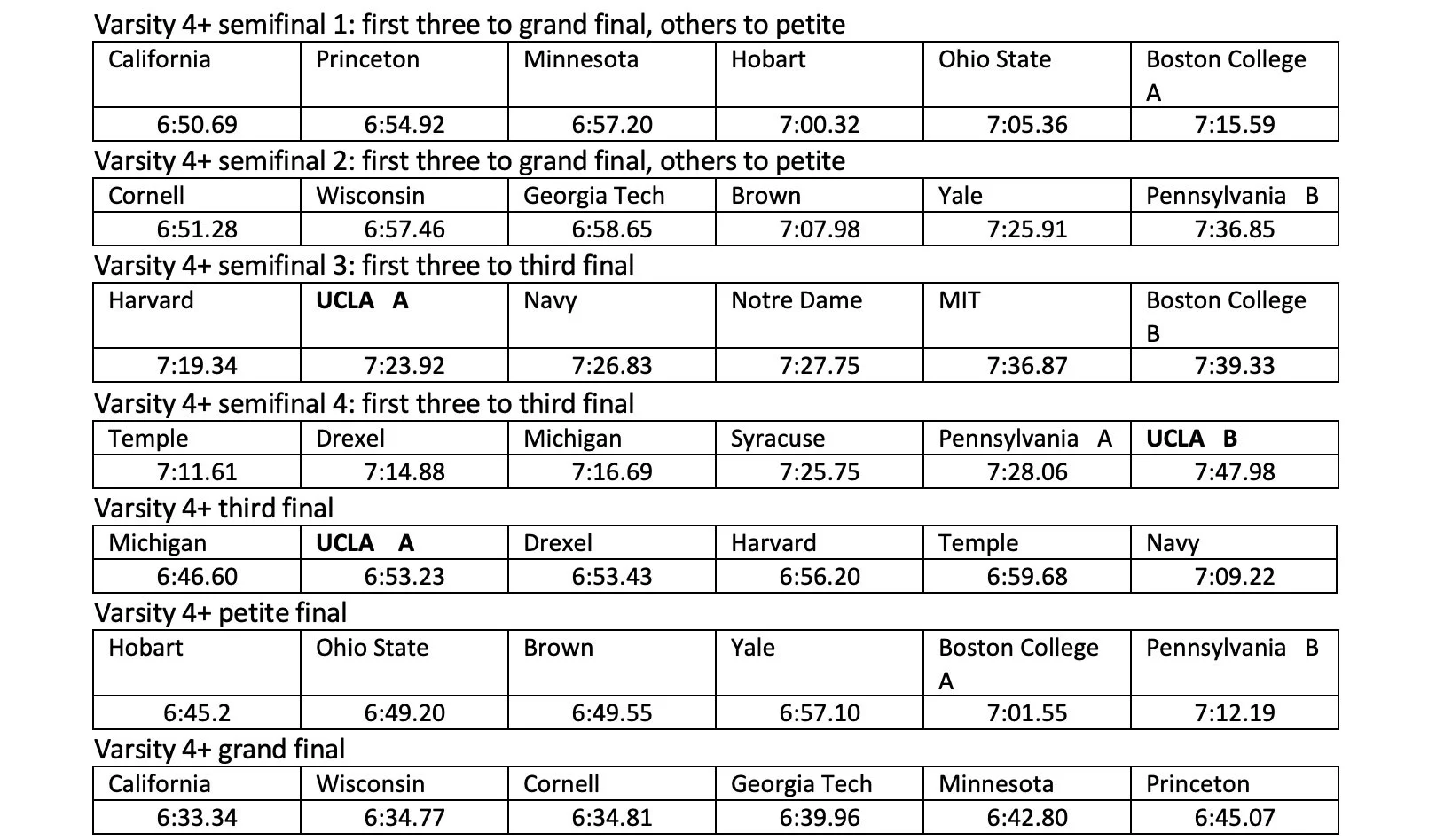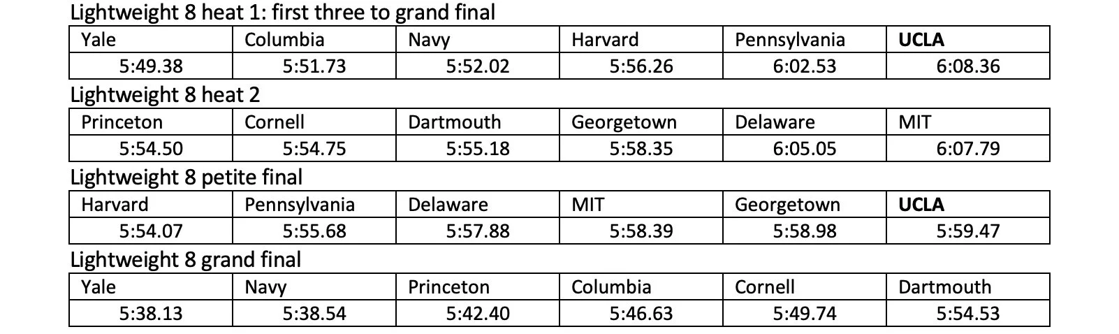 UCLA’s men returned to the IRA in the varsity four and the lightweight eight. The lightweight eight, composed of athletes from the varsity and novice eights, finished last in its heat and last in the petite final of the twelve crews entered in the event. The crew was described by coach McMahan as “long on power but short on experience.” The varsity four competition had 24 entrants and the progression consisted of heats, repechages, and semifinals to three levels of finals. UCLA’s entry finish fourth in a semifinal for the third level final, overall having beaten the U.S. Military Academy twice and Columbia once.