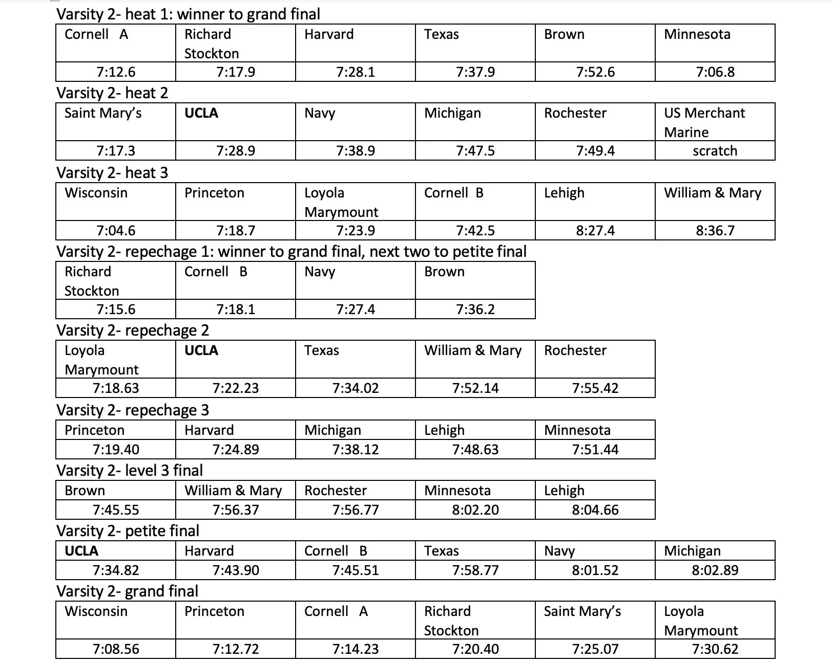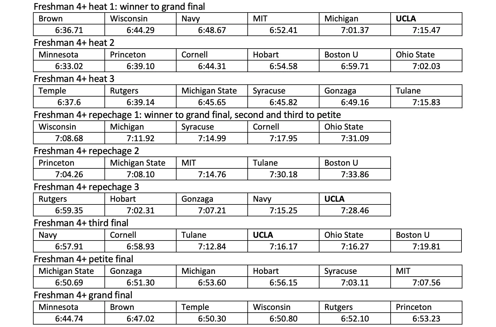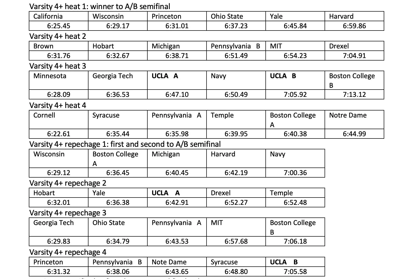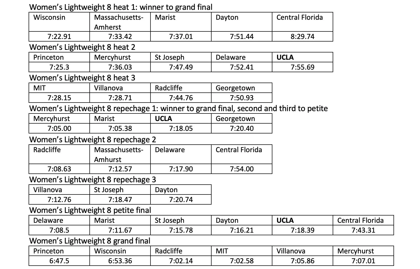 UCLA’s men returned to the IRA in the varsity four and the lightweight eight. The lightweight eight, composed of athletes from the varsity and novice eights, finished last in its heat and last in the petite final of the twelve crews entered in the event. The crew was described by coach McMahan as “long on power but short on experience.” The varsity four competition had 24 entrants and the progression consisted of heats, repechages, and semifinals to three levels of finals. UCLA’s entry finish fourth in a semifinal for the third level final, overall having beaten the U.S. Military Academy twice and Columbia once.