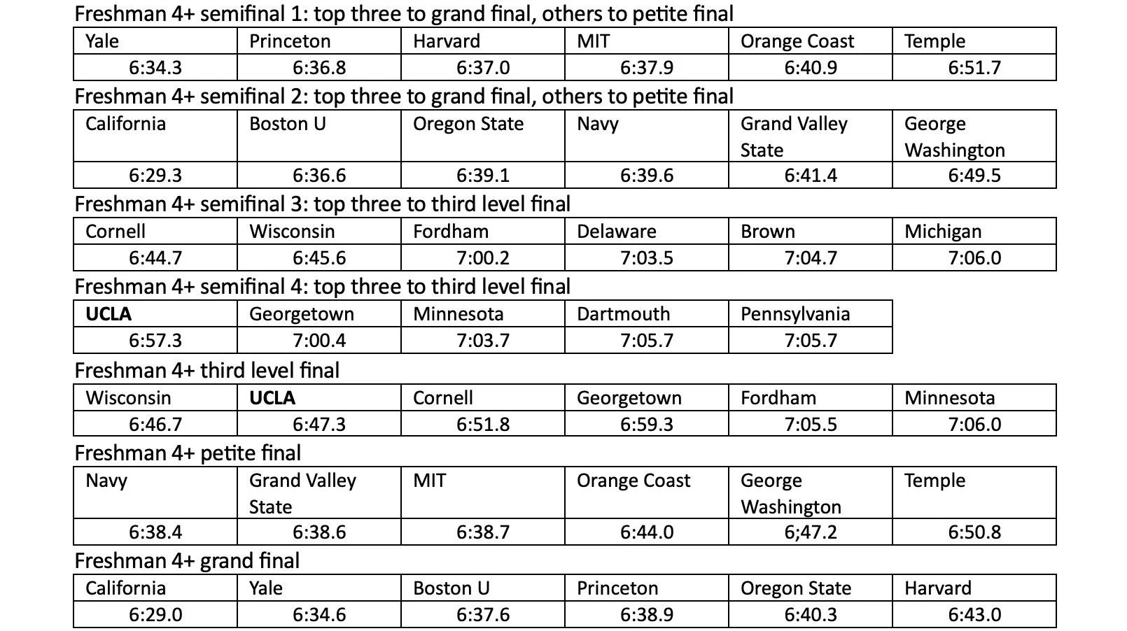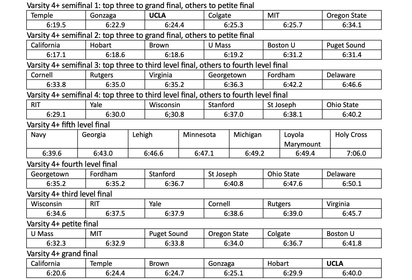 However with 31 entries the varsity 4+ was the only event at the championship that used a time trial to a semifinal to finals. UCLA placed eighth in the time trial: Temple 5:30.1; Brown 5:31.6; Puget Sound 5:32.5; MIT 5:33.5; Gonzaga 5:34.8; U Mass 5:35.4; California 5:35.7; UCLA 5:35.8. The 12 fastest from the time trial advanced to the A/B semifinals, the next 12 to the C/D semifinals, the remainder to the E final.
