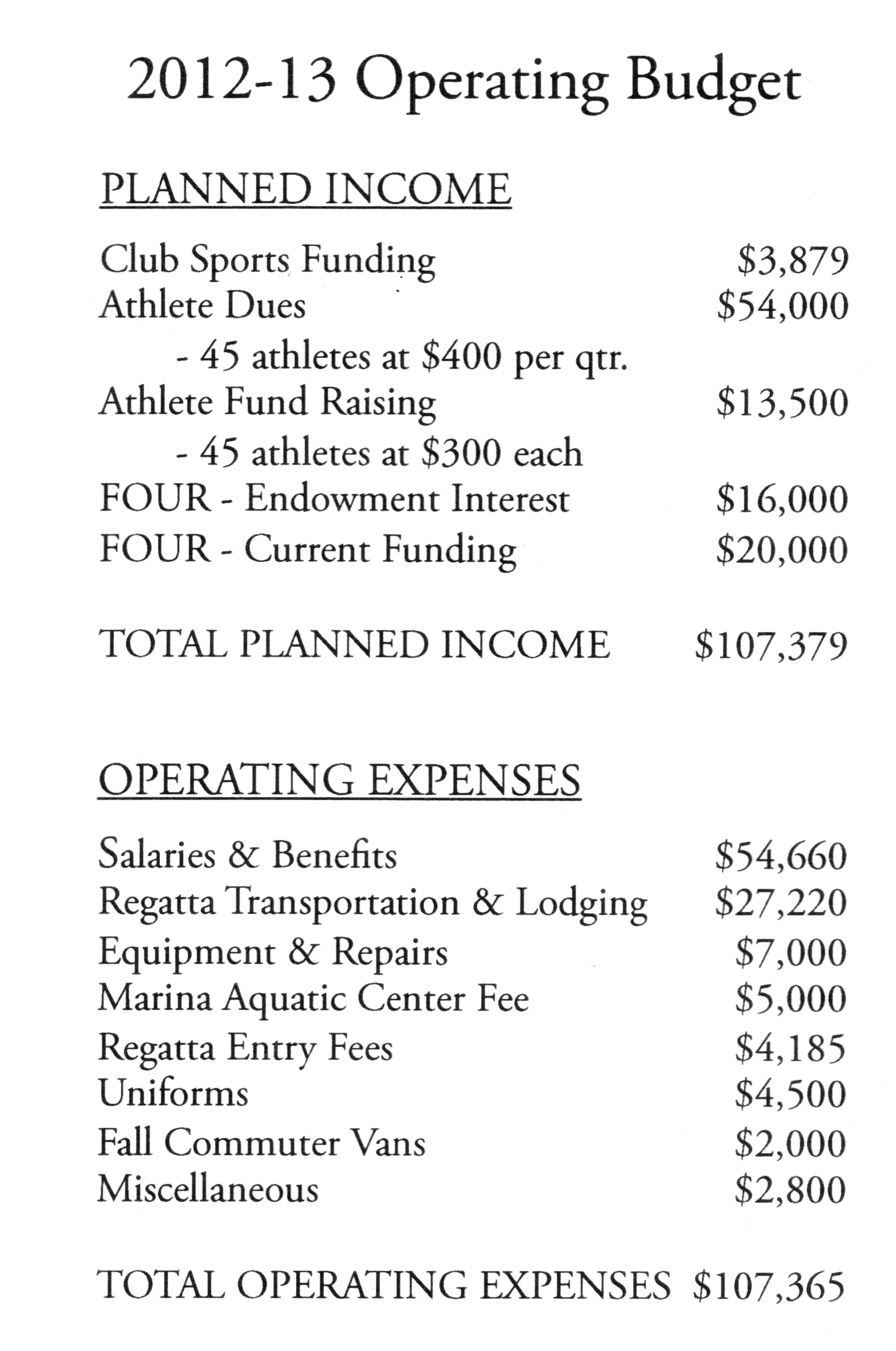 The amounts planned for the 2012/13 budget was augmented by the carry-over of $43,601 from the previous budget year and was used in large part by the purchase of a new varsity racing eight.