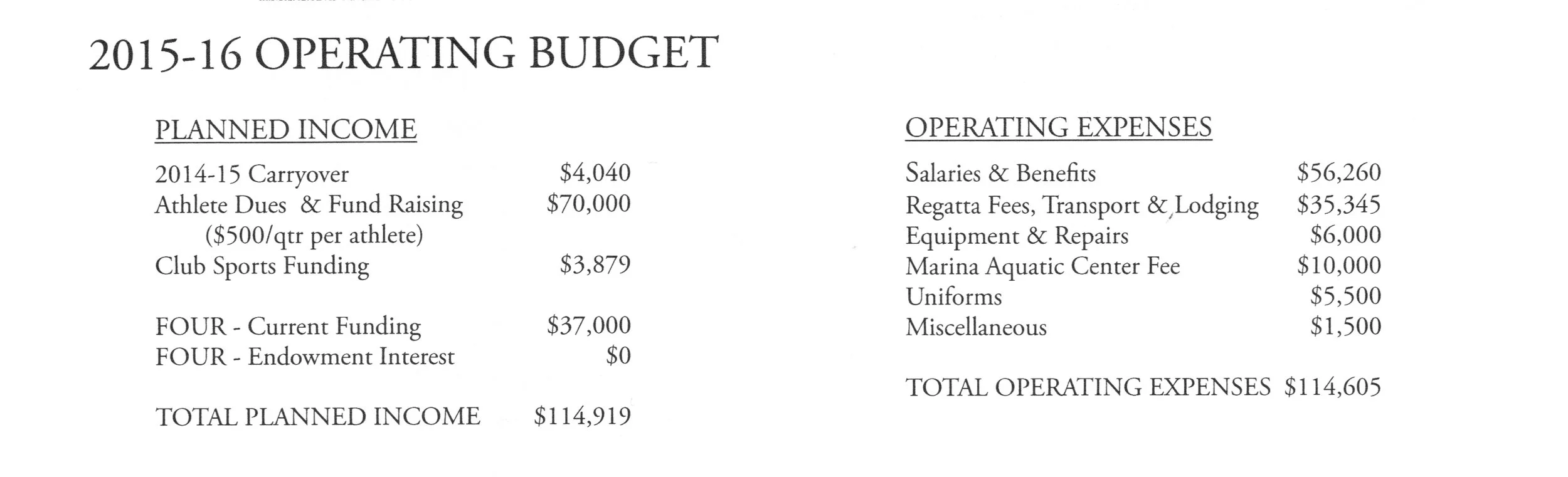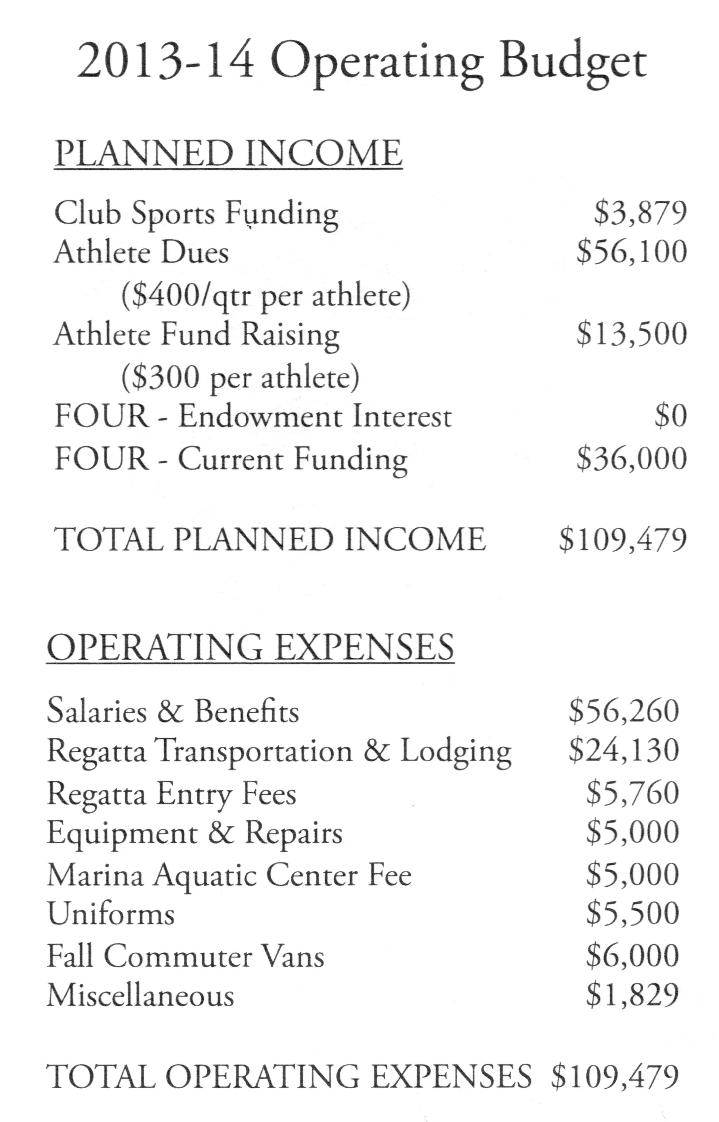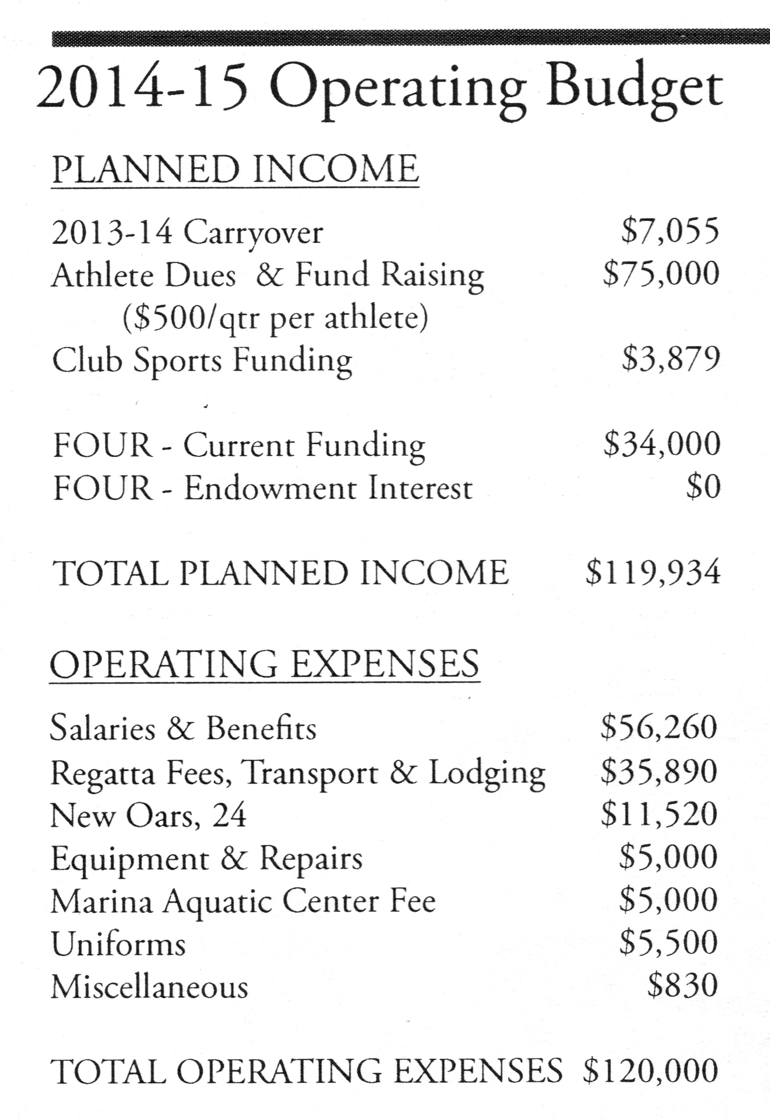 A “500 Club” was established to recognize donations of $500 or more to the endowment. The endowment grew to surpass $500,000. Increasing $60,000 during the prior 12 months it grew from $498,236 to $558,144. Alumni donations of $34,909 and not drawing the available interest return in either 2013-14 or 2014-15 spurred the increase. There was $44,653 of current investment funds available for distribution if needed. Athlete dues of $400 per quarter and a $300 fundraising obligation remained, still representing over 62% of the budgeted income supporting the program. Brian Smith, the Program Director of Competitive Sports acquired several vans for exclusive use by the team to transport novices to and from practice at the Marina, with the team only paying for gas. Specific funding needs included two or three sets of new oars and paying to transport the athletes to the ACRA Championship. A “Boat Movers Club” was also established to fund day-to-day maintenance and equipment items with a goal of $16,870. The list consisted of: