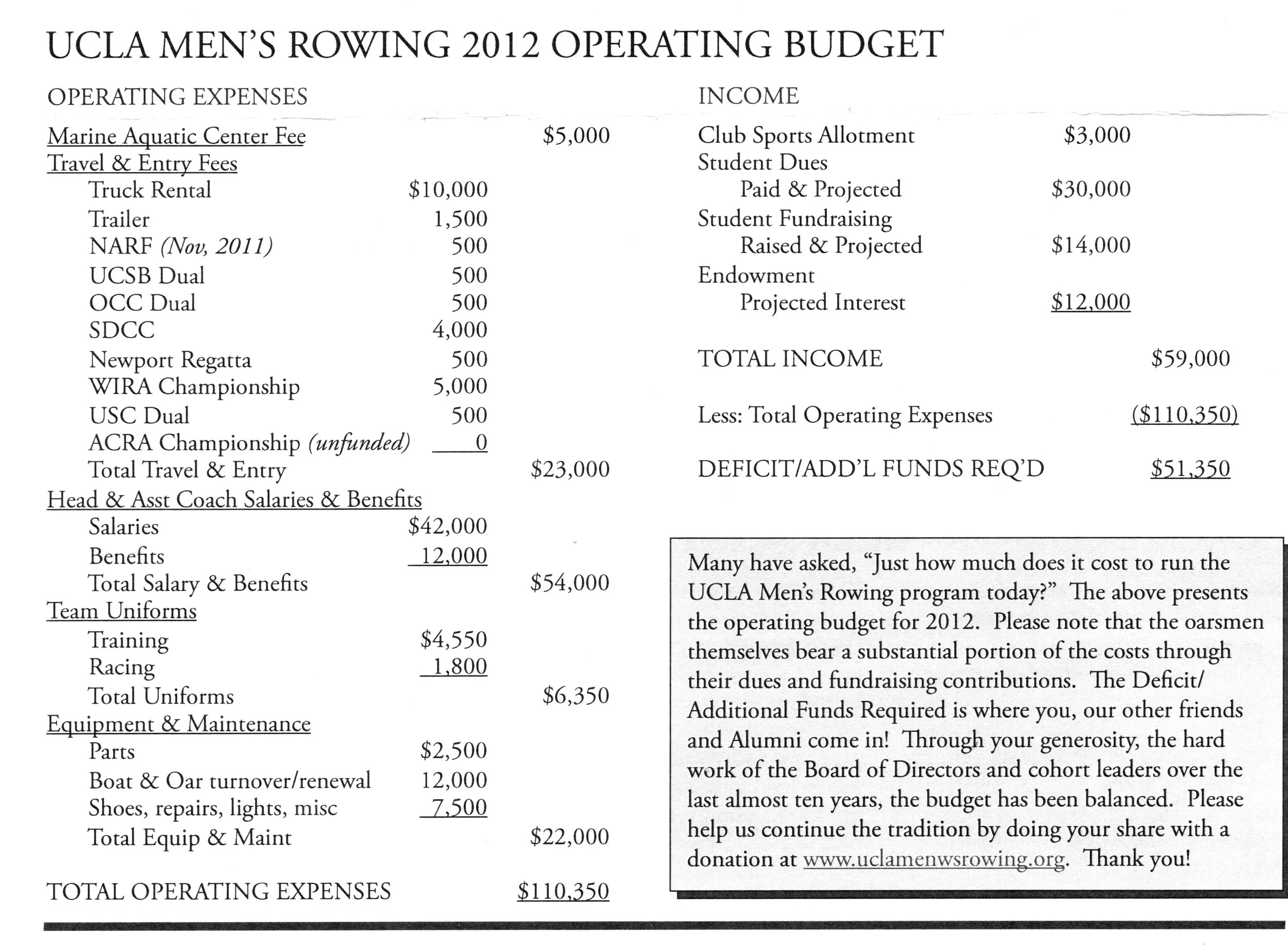 Athlete dues were $400 per quarter, $1,200 for the full year, plus a $300 fundraising obligation (erg-a-thon, concert and auto show hours with Staff Pro, student letter writing campaign, or the sale of UCLA Crew apparel). In February there was still a need to raise $51,350 for the program given the planned budget. The banquet raised over $15,000 and included to introduction of a new racing eight, the “Dr. Norman E. Witt”, christened at the alumni races the following day. The banquet also included bidding on inscriptions at the nine seats in the new eight. By June 2012 greater income and lower expenses, in part due to deferring the equipment turnover/renewal and greater athlete dues income, resulted in a $43,601 surplus. The surplus was to be spent on 2 RowPerfect ergometers ($6,900), additional replacement/spare boat parts ($3,500), a new Cox Box and parts ($900) and new bow lights ($500). That left $31,801 available for the purchase of a new racing eight-oared shell for the varsity, either a Hudson or a Filippi.