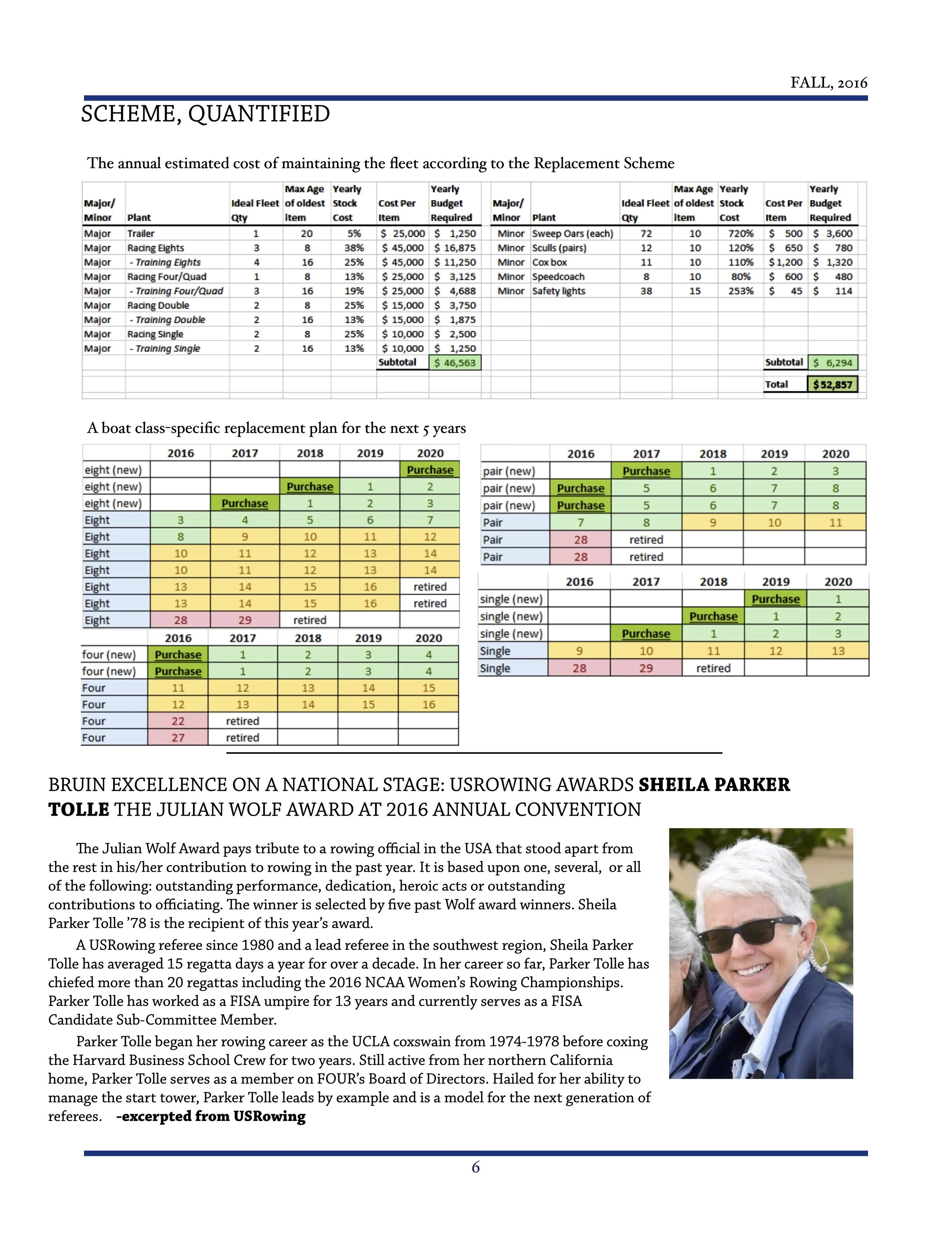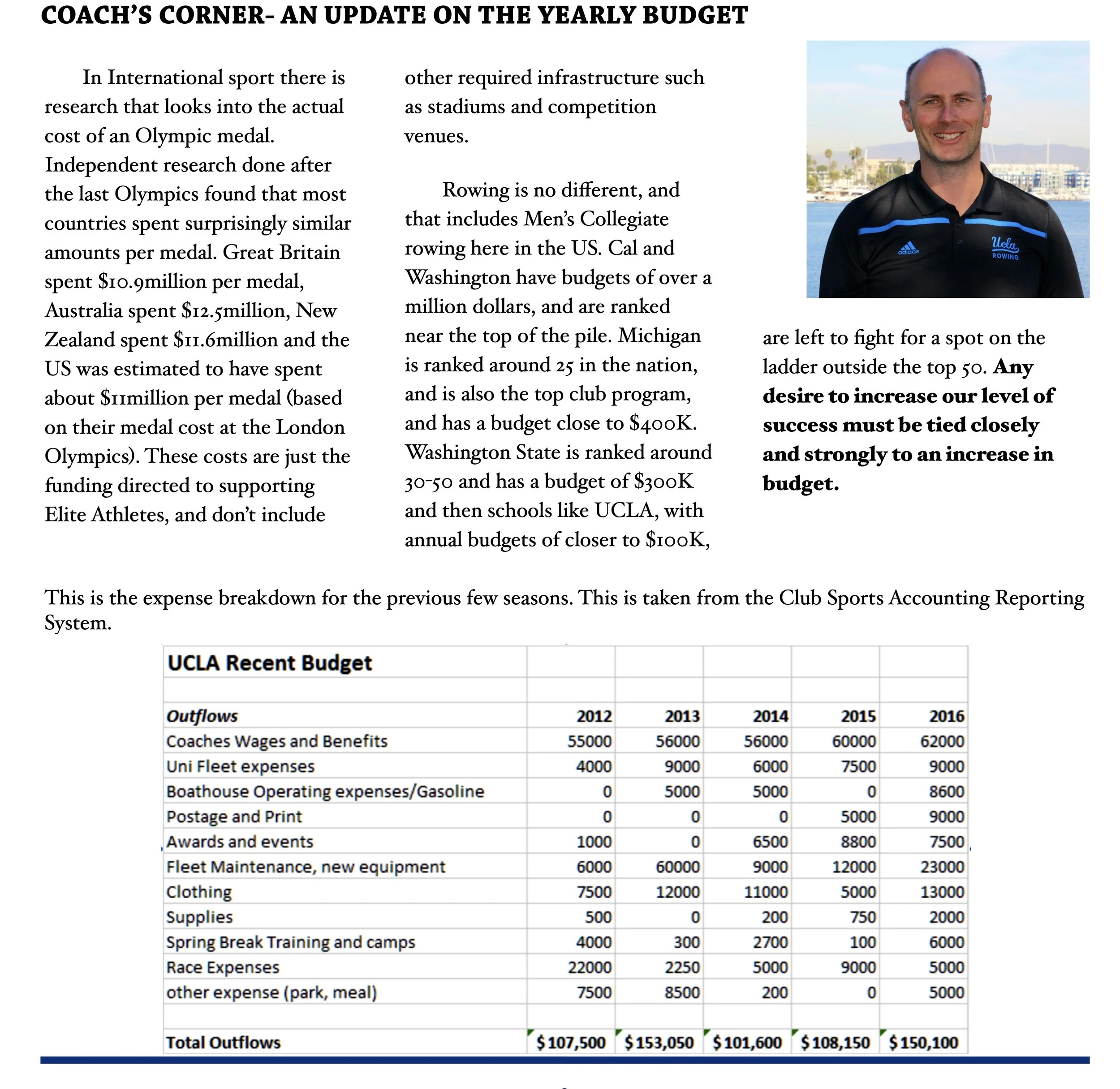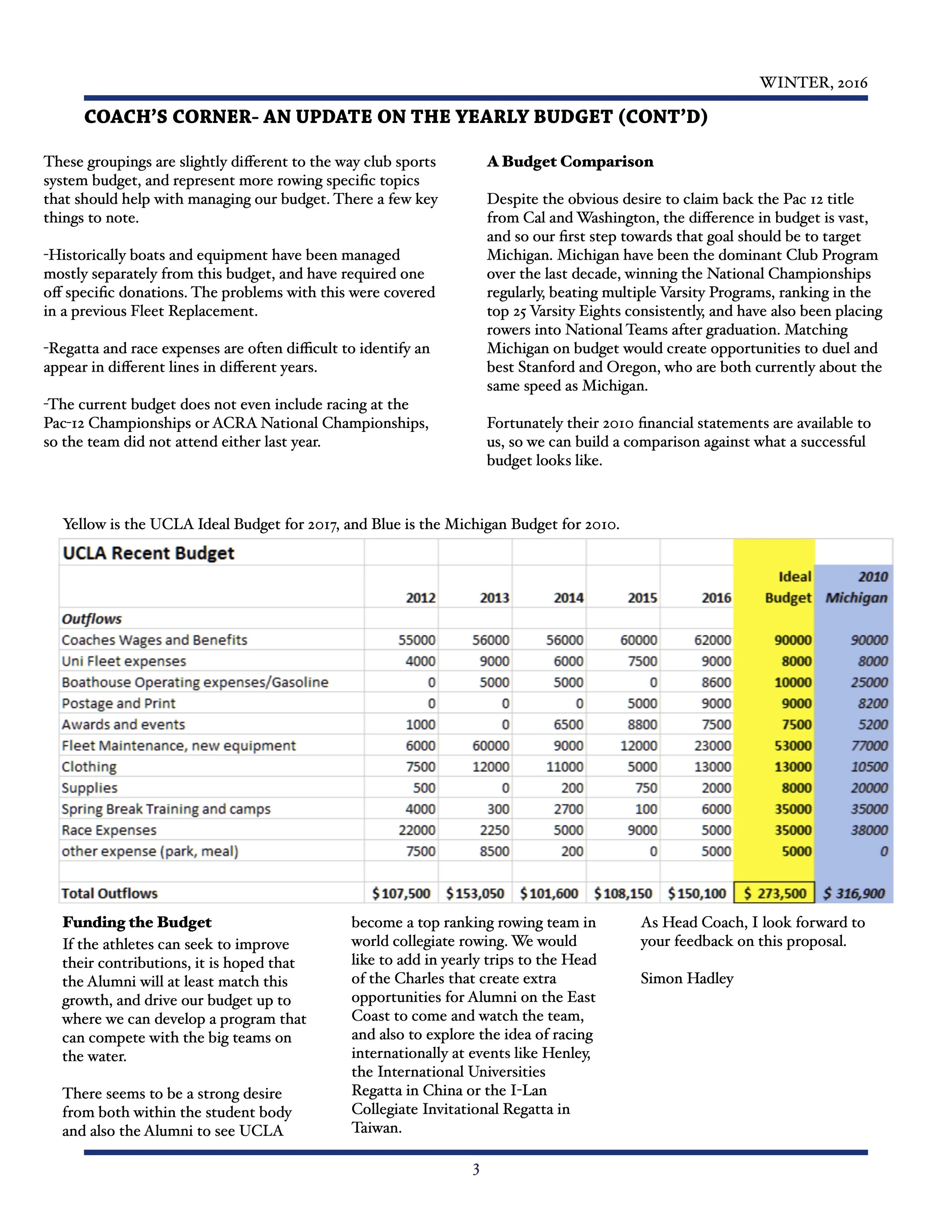 Coach Hoadley released a comparison of the program budget of the previous five years compared to the 2010 budget of the club rowing team at the University of Michigan and his proposal for an ideal budget for the UCLA men’s program and calling for greatly increased funding. Simon Hadley, “Coach’s Corner – An Update on the Yearly Budget”, Strokewatch, Winter 2016, 2-3.
