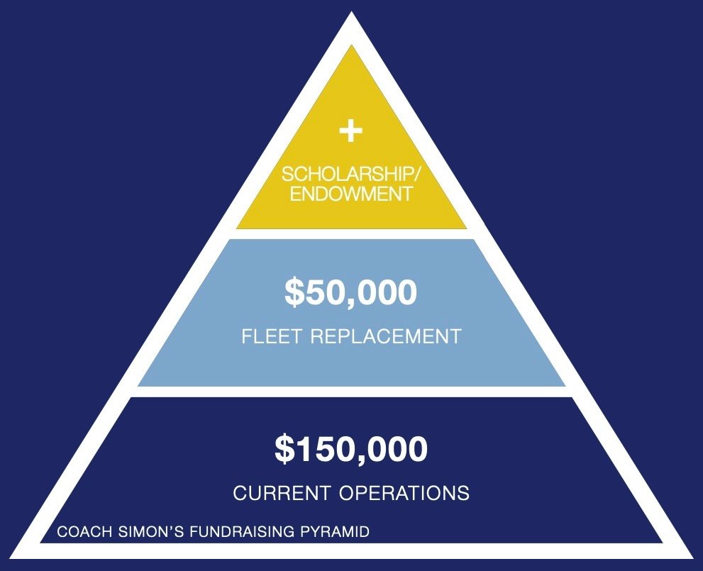 Based on support from the alumni Coach Hoadley was able to add usable equipment and to grow the roster of the program up to 51 who raced the championship regattas. Of the current roster only six were graduating, leaving the team well positioned to additionally grow the roster next season. During the 2017/18 fiscal year $275,865.32 was raised, representing 122% of the annual goal. Through December 13, 2017, $90,522.17, representing 45.26% of a goal of $200,000 {$150,000 current operations, $50,000 equipment}had been raised. Two Filippe eights were offered for naming rights prior to the banquet at $15,000 each, instead of the full cost for each at over $35,000, going to Terry Oftedal and Duncan Henderson. The wine auction at the banquet raised $1,440 from 21 donors and the seat naming auction raised an additional $26,435. Coach Simon’s Fundraising Pyramid had three levels. The pyramid was introduced as having a $150,000 base for Current Operations but that was later increased to $175,000, $50,000 at the next level for annual Fleet Replacement, and “+” at the peak for Scholarship/Endowment. Strokewatch, Summer 2018, 9.