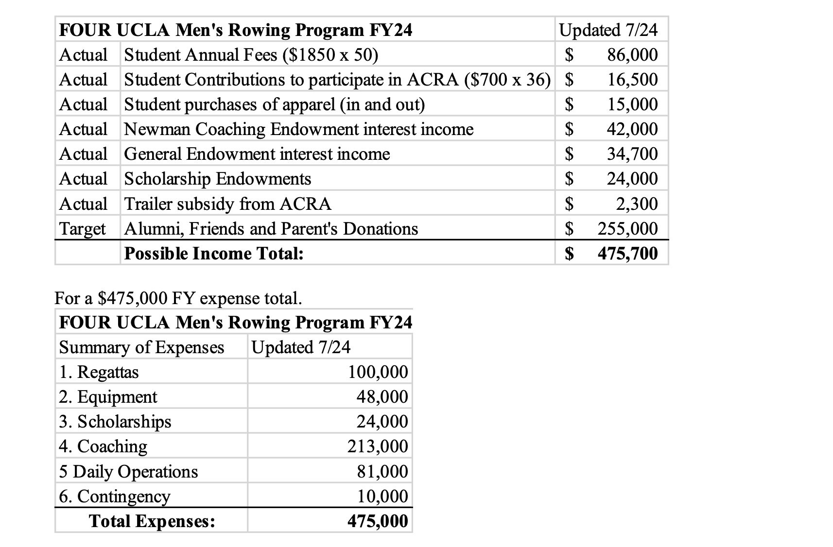 Significant progress was made in fiscal year 2024 on the Endowment Funds. A total of $ 192,377 was received up to 30 June 2024 (not including the Newman fund, that Bob and Mary Jo Newman continued their project towards $2.5M and contributed $500K in fiscal year 2024). There were 62 individual donations to the endowment fund. This includes $100K from Tim and Joni Powers (Tim was captain of the 1977 crew), $50K from the group of Bruin Oarsmen (predecessor to FOUR) through Bob Frassetto (captain of the 1978 crew) and significant donations from Barry Berkett and Geof Strand. This can be compared to a total raised for endowment in fiscal year 2023 of $11.5K and fiscal year 2022 of $9.5K. Within the donations by alumni, friends and parents there were 375 individual donations. There was a great increase in total fund-raising towards current expenditure compared to FY23 for $161,000 and for FY22, $207,000. A “Season of Giving”campaign was inaugurated as a primary solicitation among friends of the program from November 28 through December 31 and later extended into January, in addition to the spring banquet and auction for a $475,000 FY expense total.