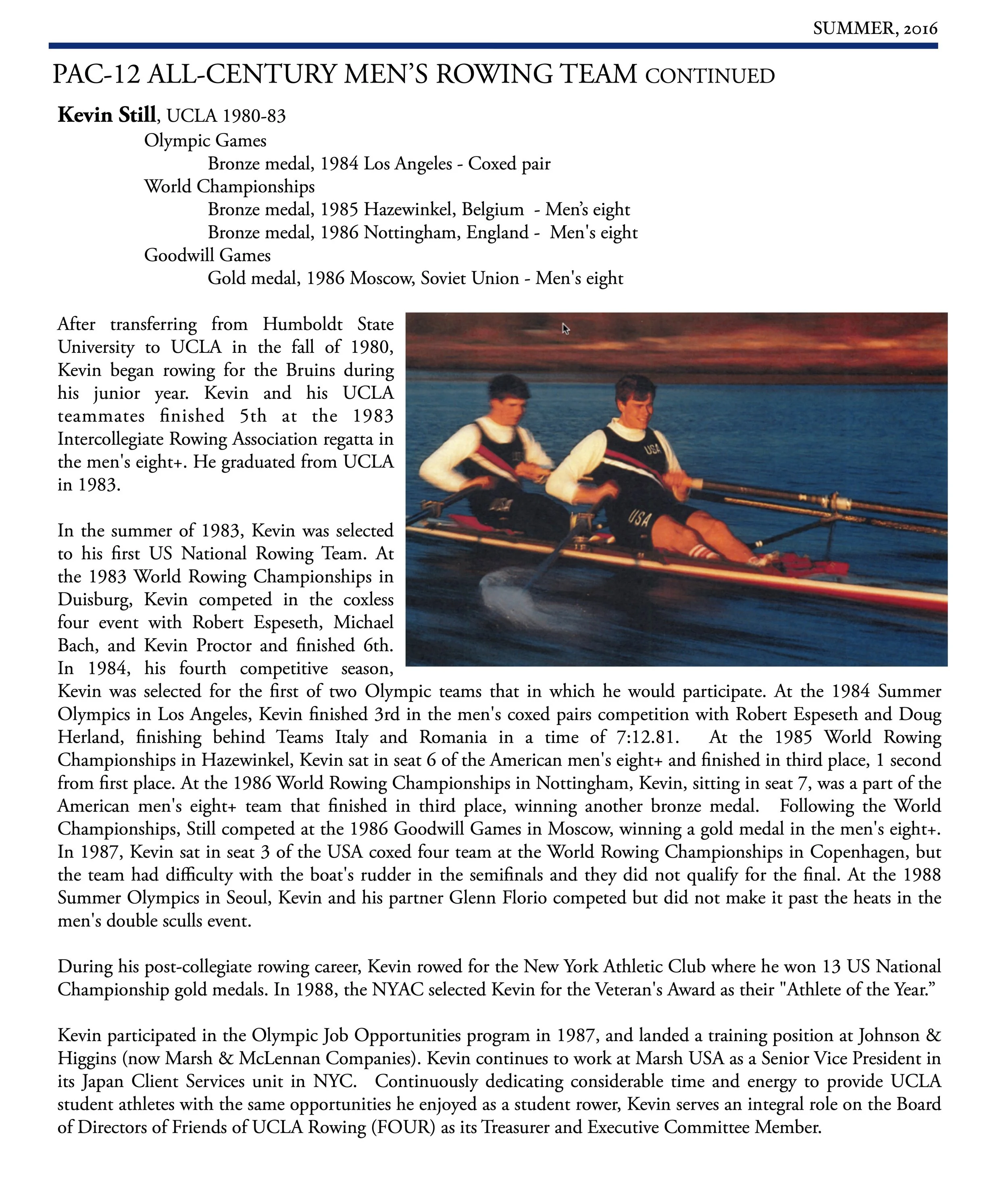 Bower has been called the greatest all-around women's crew athlete in UCLA history (1978-79). A bronze medalist in the 1979 World Championships, Bower joined the U.S. National Women's Rowing team in 1980. She was a three-time World Champion Silver Medalist (1981–83) and took home the gold medal in the eights during the 1984 Summer Olympics. Carol was selected Oarswoman of the Year in 1982 by the United States Olympic Committee and was inducted in the Rowing Hall of Fame in 1984. Bower graduated from UCLA in 1979 and served as the head coach of the University of Pennsylvania's Women's Rowing program from 1987- 1996. She then served as the head crew coach at Bryn Mawr College. “Carol Bower”, UCLA Hall of Fame web, https://uclabruins.com/honors/hall-of-fame/carol-bower/125