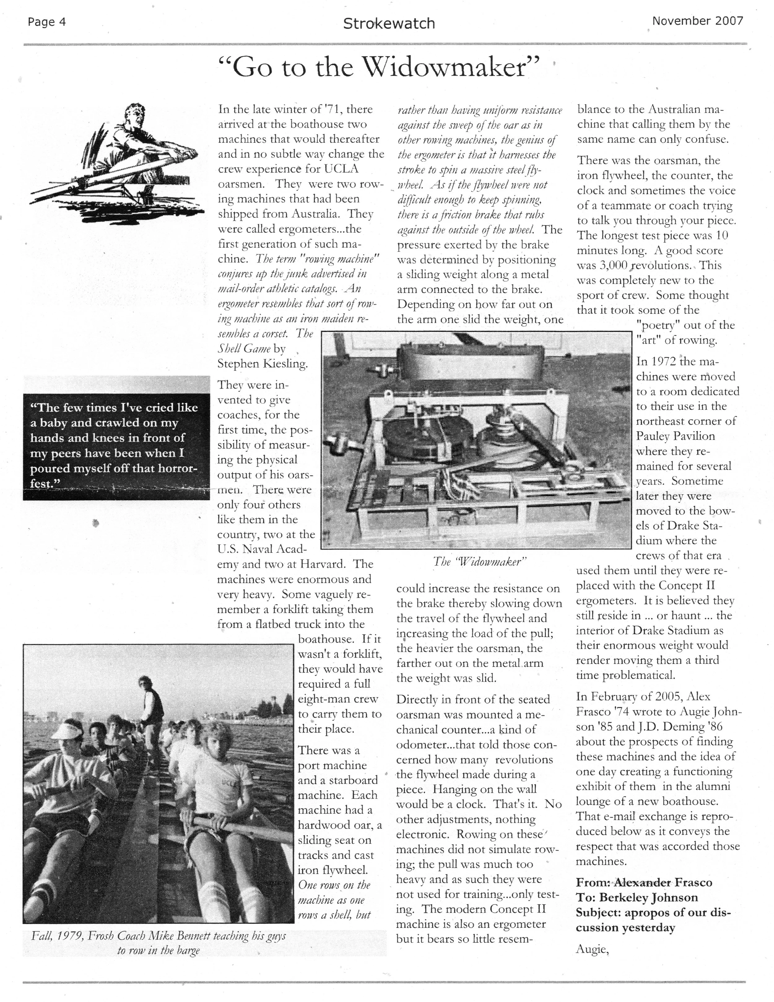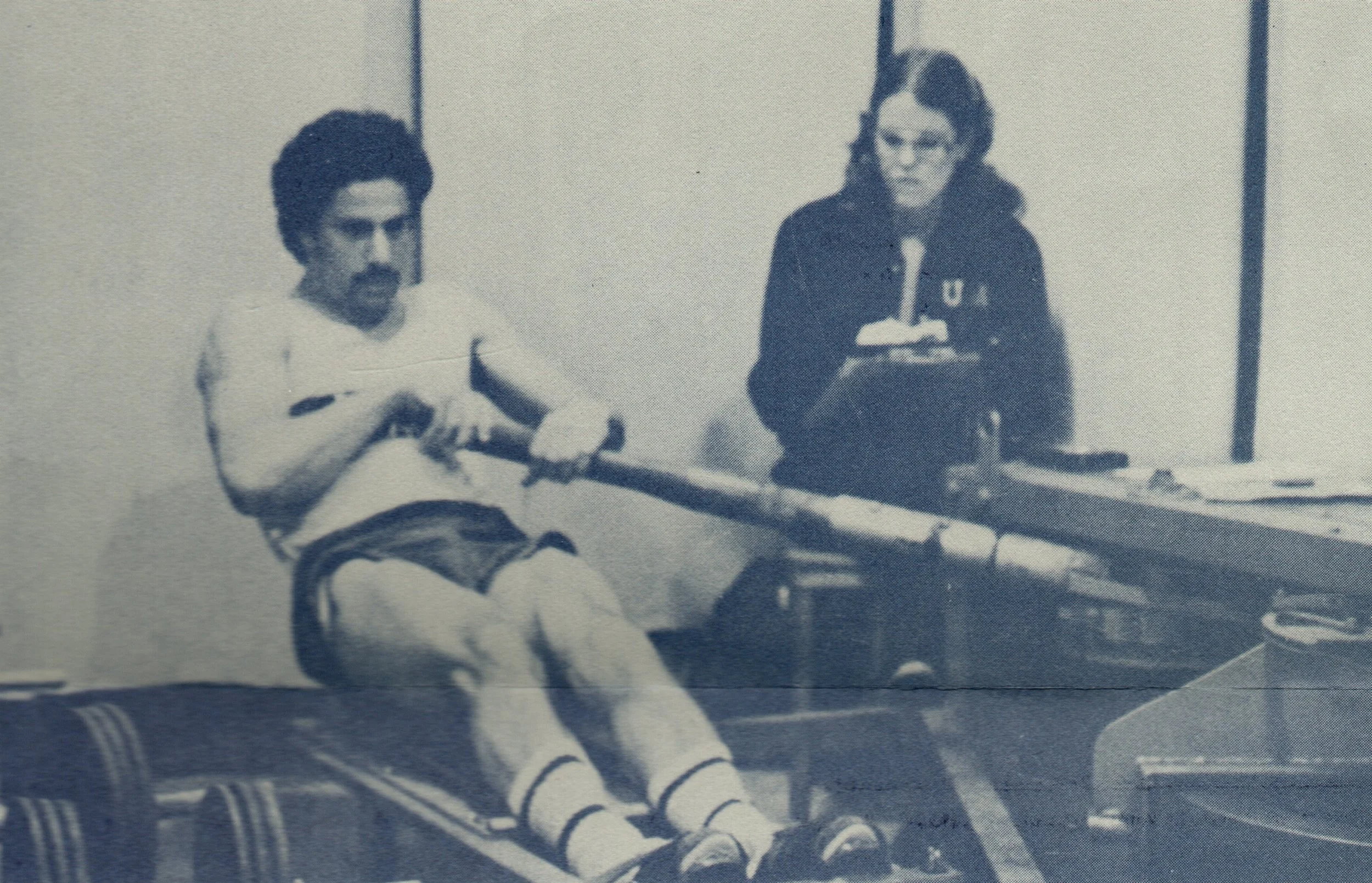 A pair of the Australian ergometers arrived at the UCLA boathouse late in 1971. There were only two other pairs of machines in the United States. One pair at Harvard and the other at the U.S. Naval Academy. In 1972 the machines were moved to room in the northeast corner of Pauley Pavilion and then later moved to an austere concrete room in that the Bruins also did weight circuits in located in Drake track stadium. They were used for testing until their replacement by Concept2 rowing machines.
