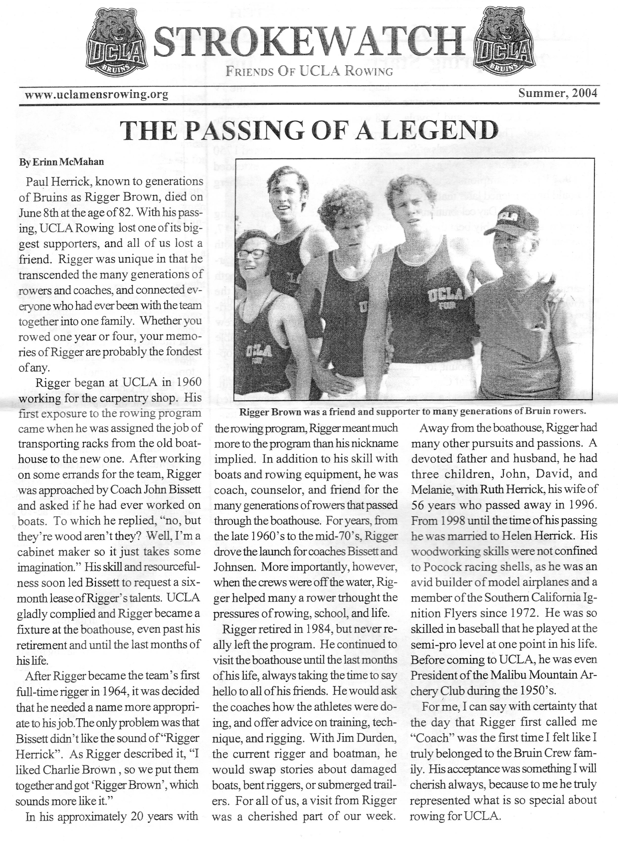 Rigger Brown of UCLA is no exception. Since 1963 he has seen three coaches and uncountable young men and women pull shells in and out of the boathouse racks. He has mended shells nearly as many times as crews have used them. He has also mended personnel clashes and what Rigger refers to as “loser’s blues.”